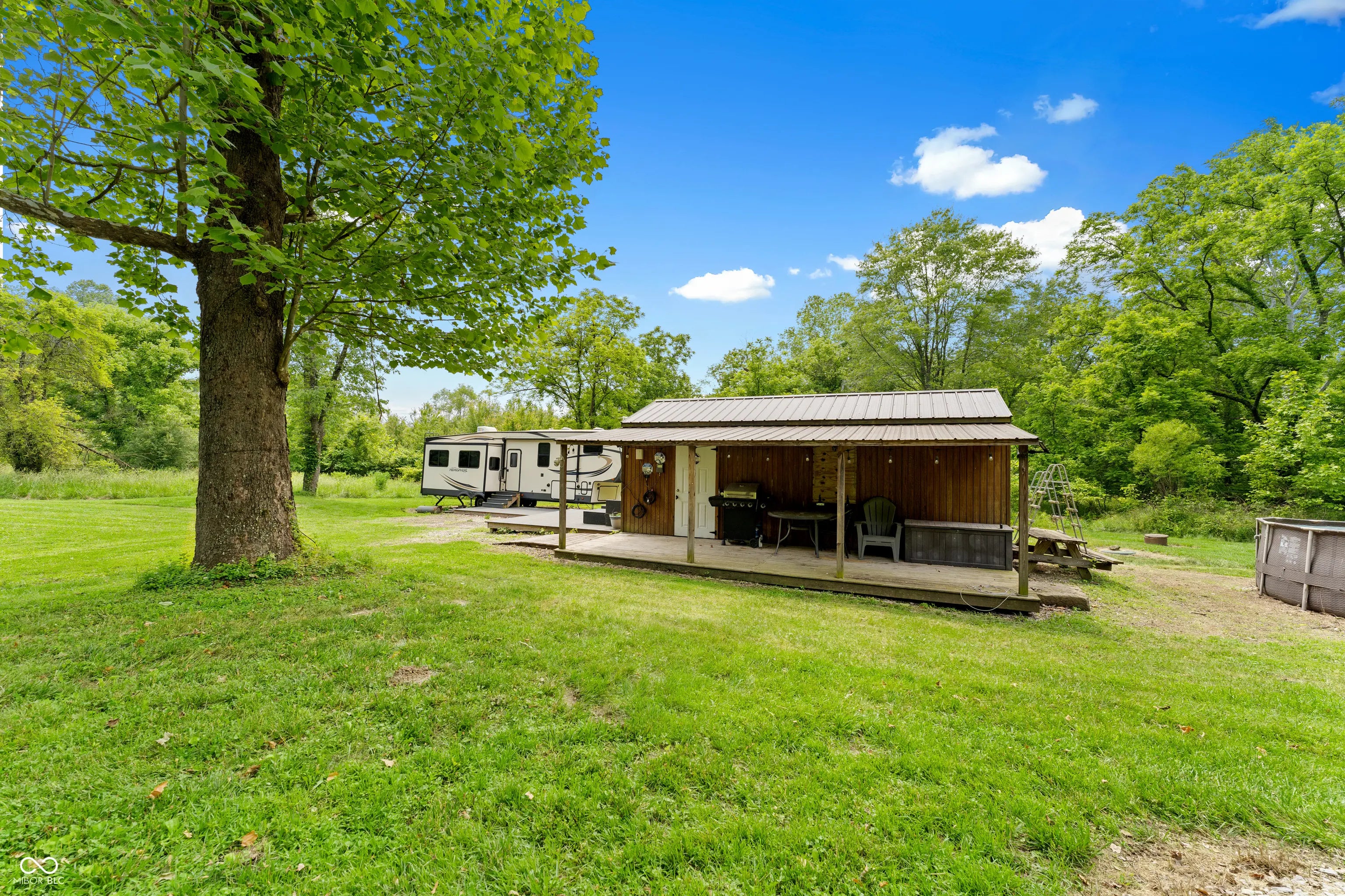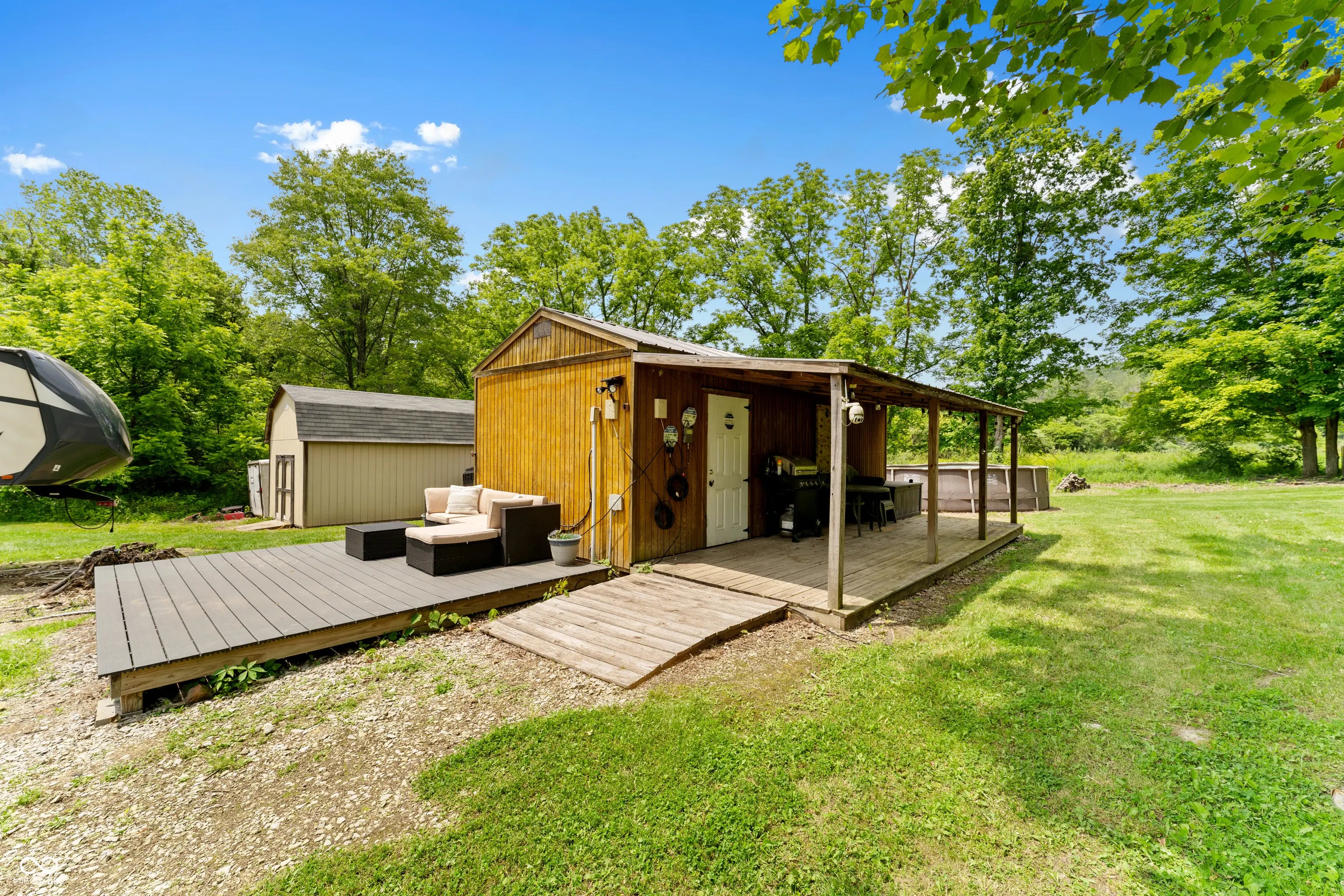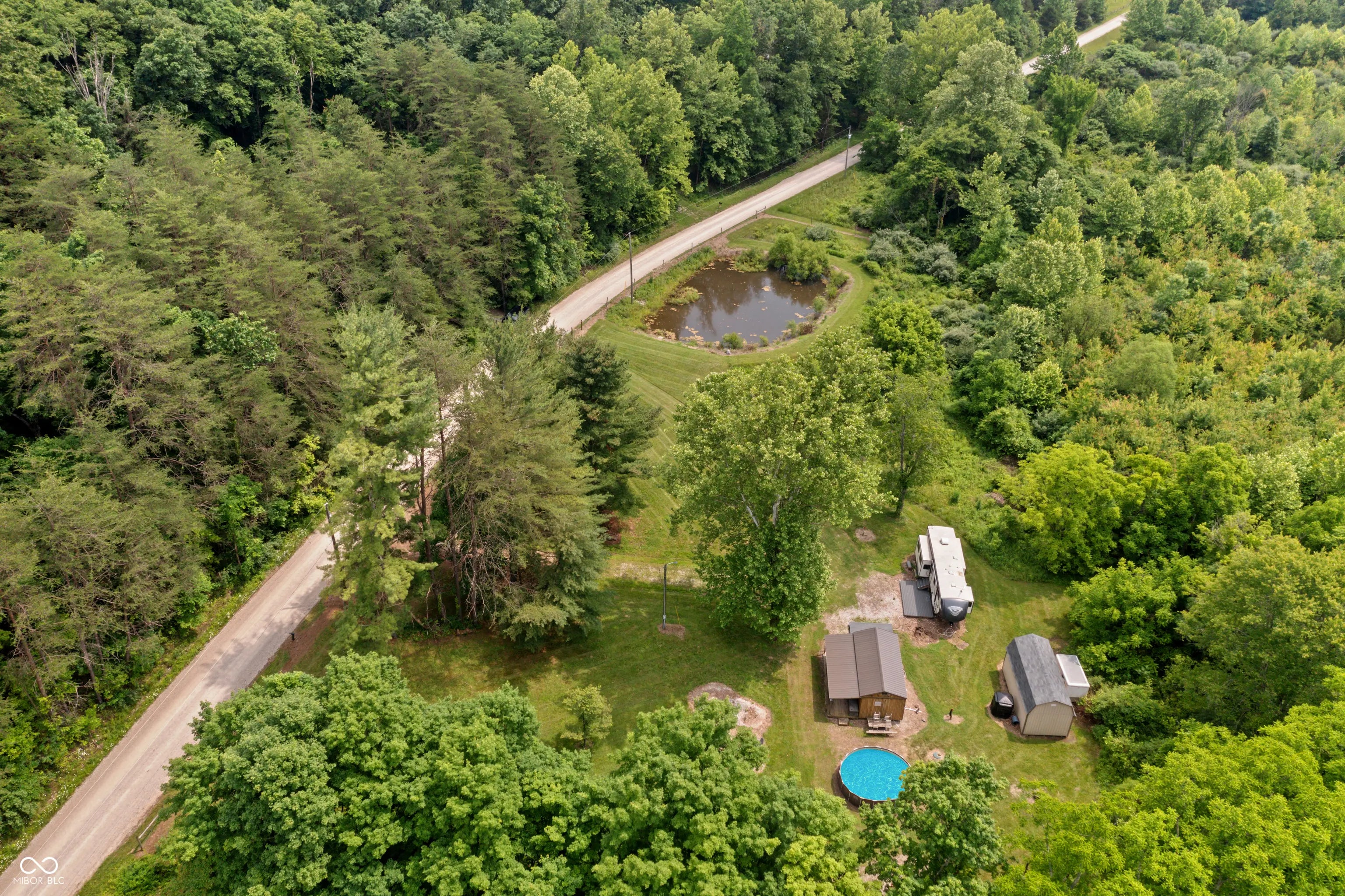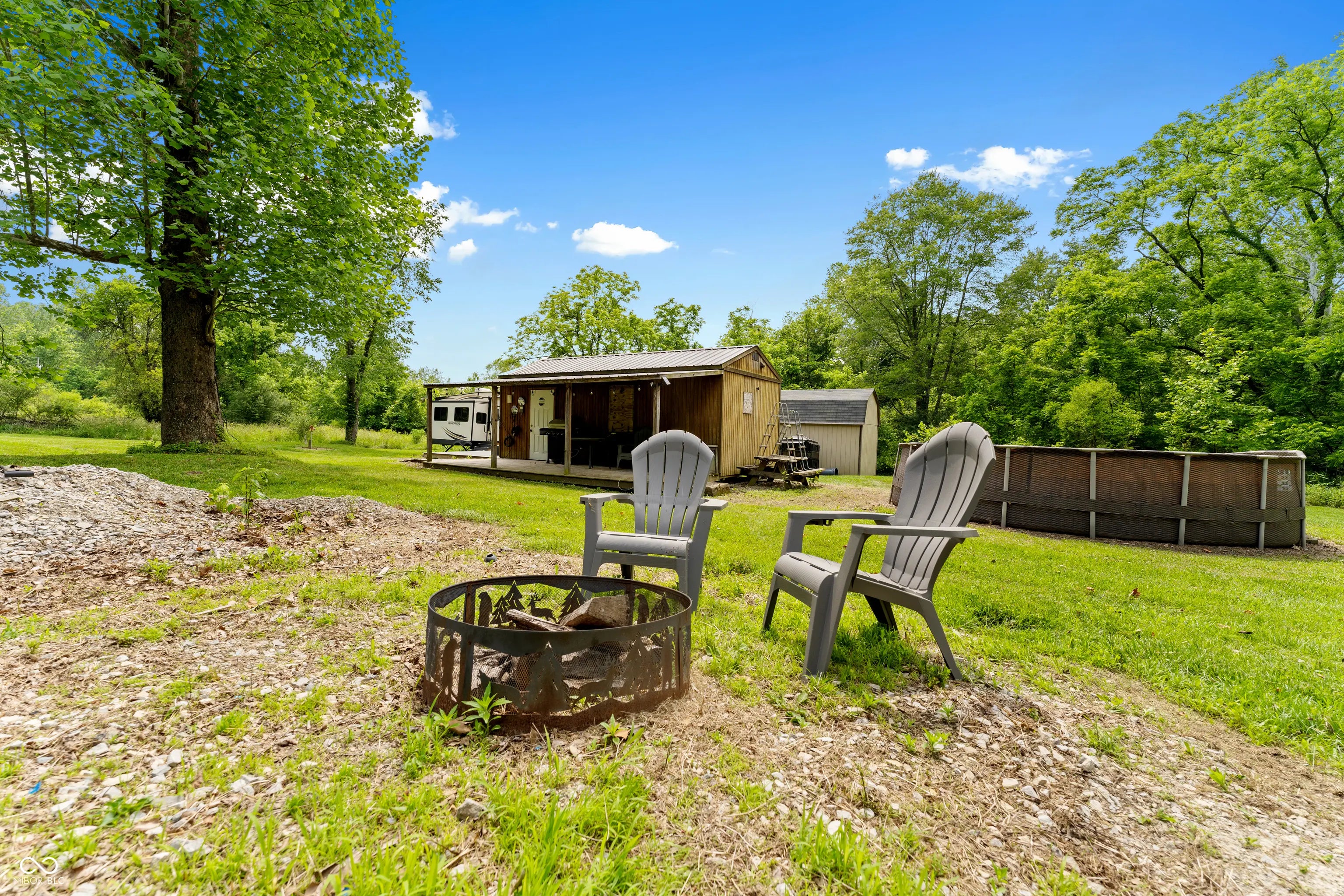 Discover the ultimate retreat for nature lovers and outdoor enthusiasts! This beautiful rural over 17 acre property features rolling wooded hills, abundant wildlife, tree stands, a 12x20 storage barn with a hoist & loft, a fire pit to cozy up on chilly nights, and a fully stocked pond perfect for fishing. Bordered on two sides by Hoosier National Forest, it offers unmatched privacy and direct access to expansive public land. Majority of land is wooded and includes land on both sides of Elkinsville Road! Located just beyond the historic town of Elkinsville and close to the renowned Story Inn and Brown County State Park, adventure awaits at every turn. Enjoy canoeing on Salt Creek, hike scenic trails, or hunt for mushrooms in this serene, natural setting. A rustic hunter's cabin on the property complete with a full bathroom, fridge, microwave, and covered porch provides a cozy escape. Also, the included fifth wheel camper with an attached front porch is another place to unwind and enjoy luxury camping on your own property! Above ground pool is also included with the property! Whether you're looking to unwind in nature or explore all that Brown County has to offer, this property is a rare gem!