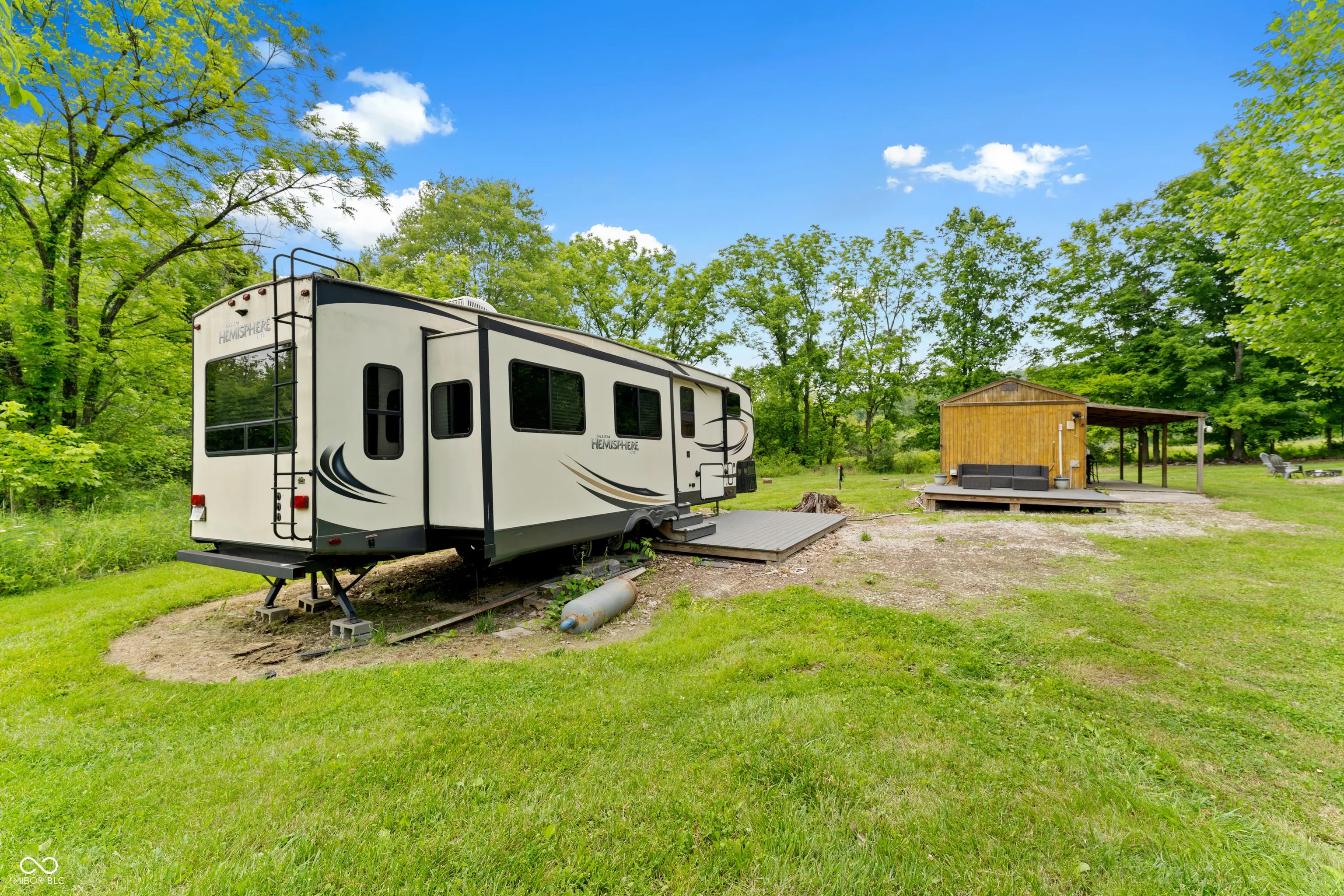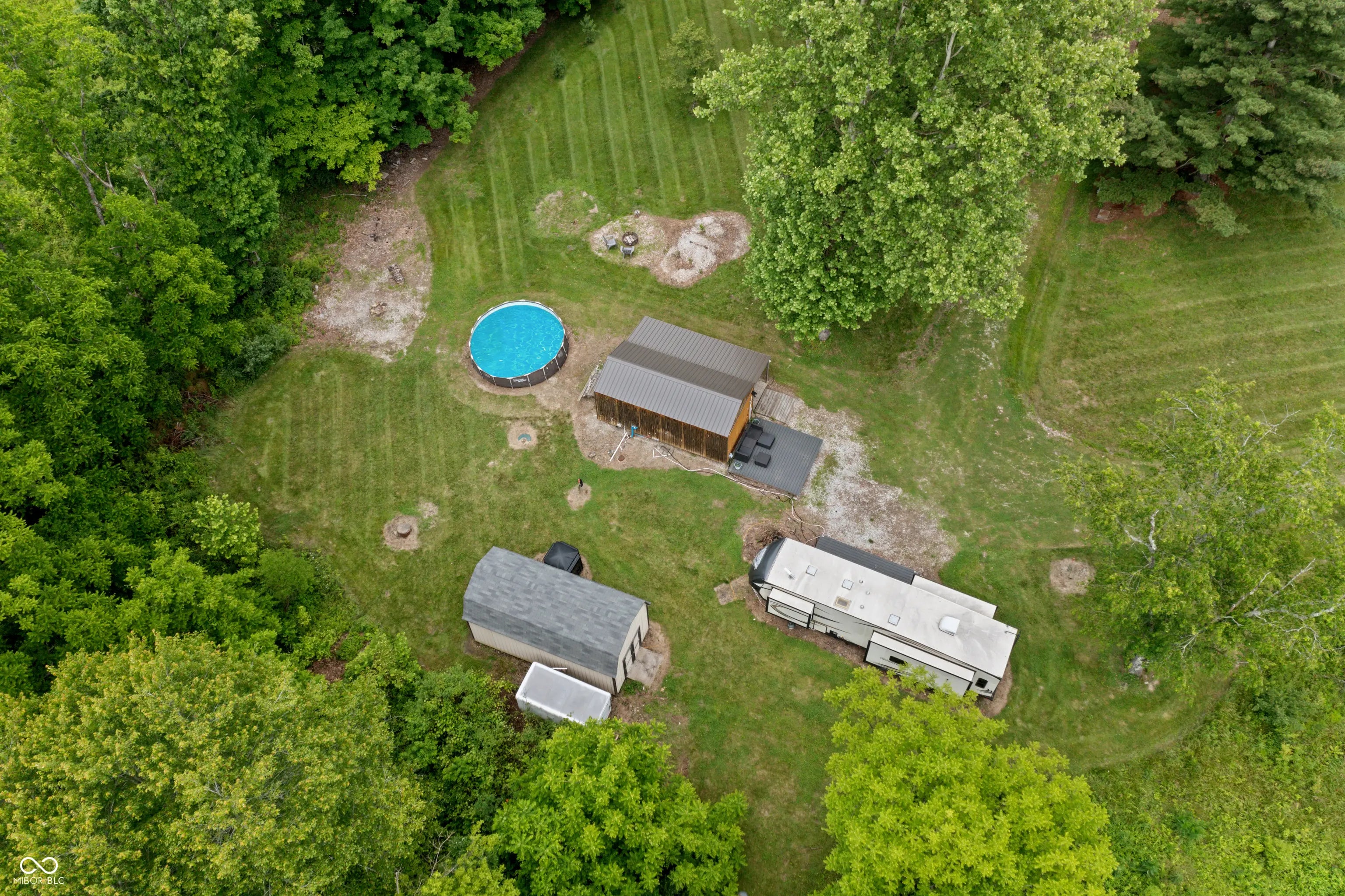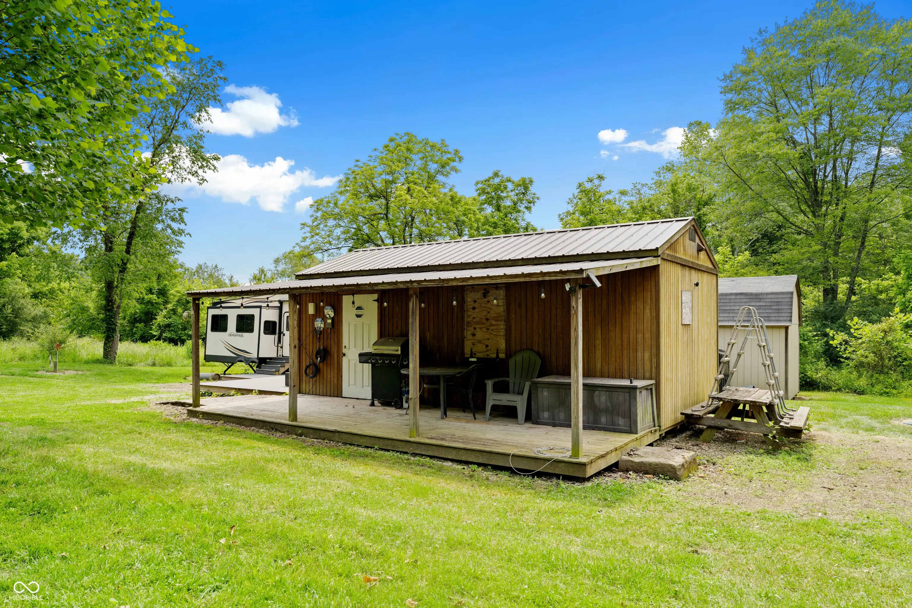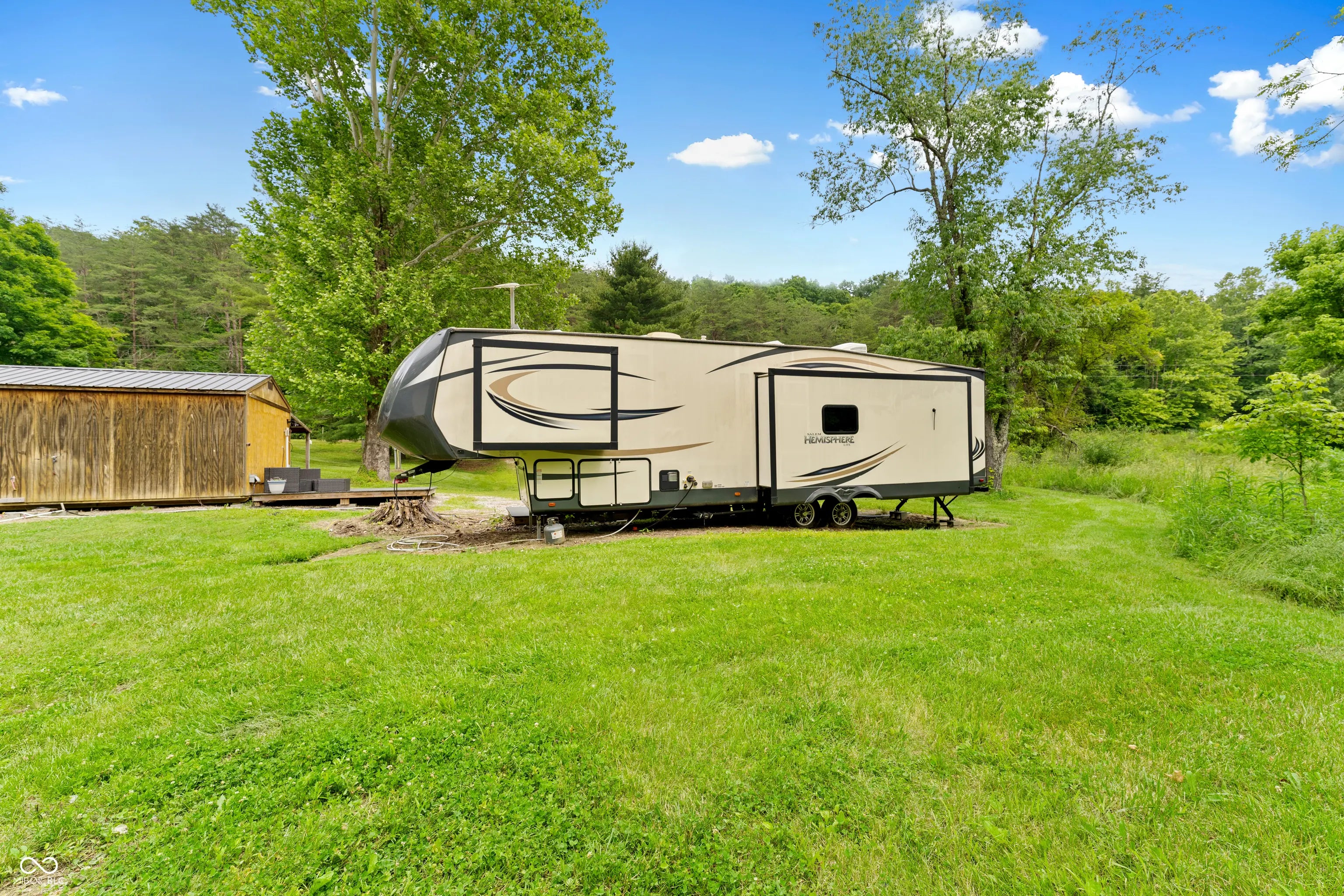 Discover the ultimate retreat for nature lovers and outdoor enthusiasts! This beautiful rural over 17 acre property features rolling wooded hills, abundant wildlife, tree stands, a 12x20 storage barn with a hoist & loft, a fire pit to cozy up on chilly nights, and a fully stocked pond perfect for fishing. Bordered on two sides by Hoosier National Forest, it offers unmatched privacy and direct access to expansive public land. Majority of land is wooded and includes land on both sides of Elkinsville Road! Located just beyond the historic town of Elkinsville and close to the renowned Story Inn and Brown County State Park, adventure awaits at every turn. Enjoy canoeing on Salt Creek, hike scenic trails, or hunt for mushrooms in this serene, natural setting. A rustic hunter's cabin on the property complete with a full bathroom, fridge, microwave, and covered porch provides a cozy escape. Also, the included fifth wheel camper with an attached front porch is another place to unwind and enjoy luxury camping on your own property! Above ground pool is also included with the property! Whether you're looking to unwind in nature or explore all that Brown County has to offer, this property is a rare gem!