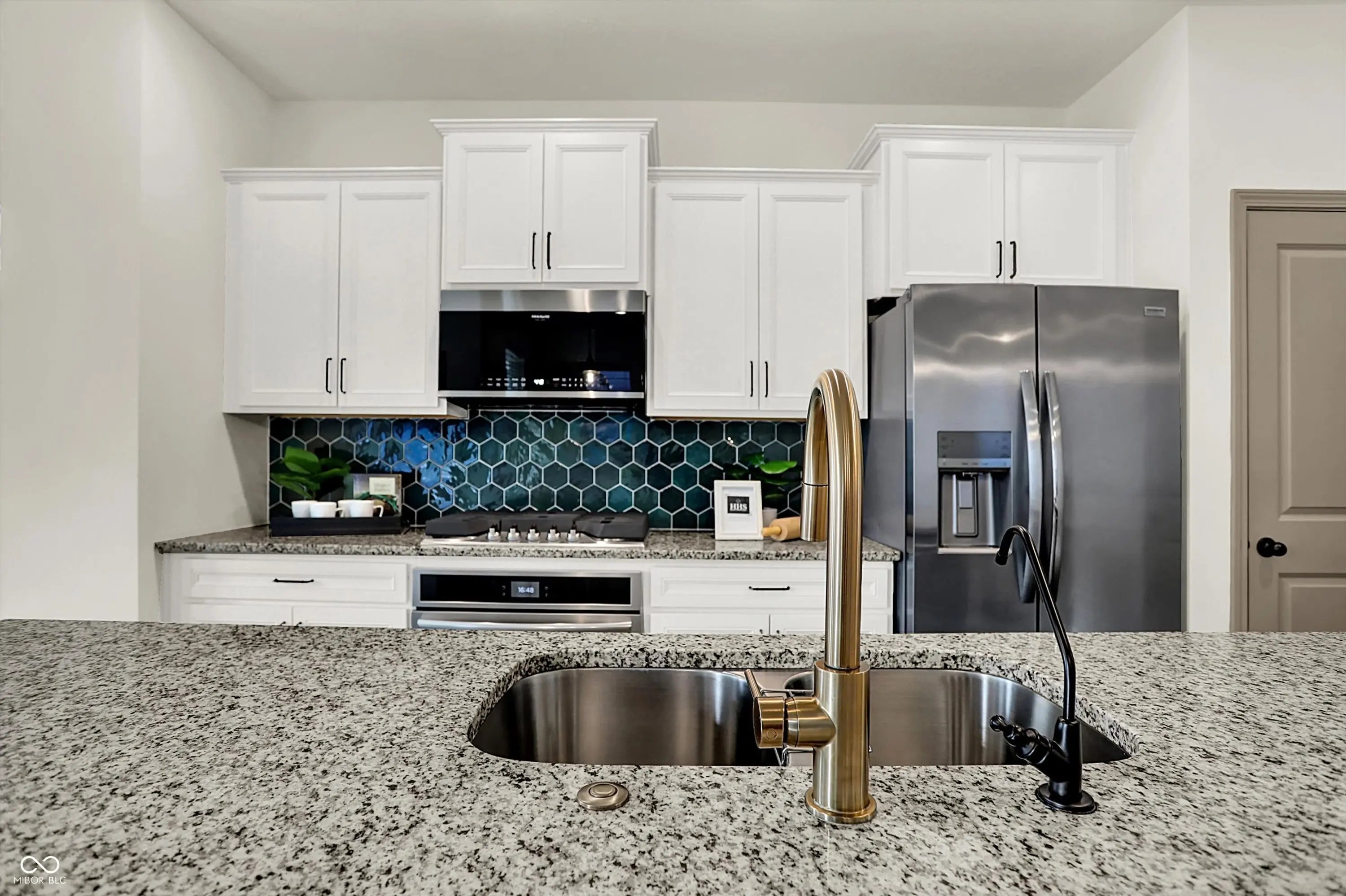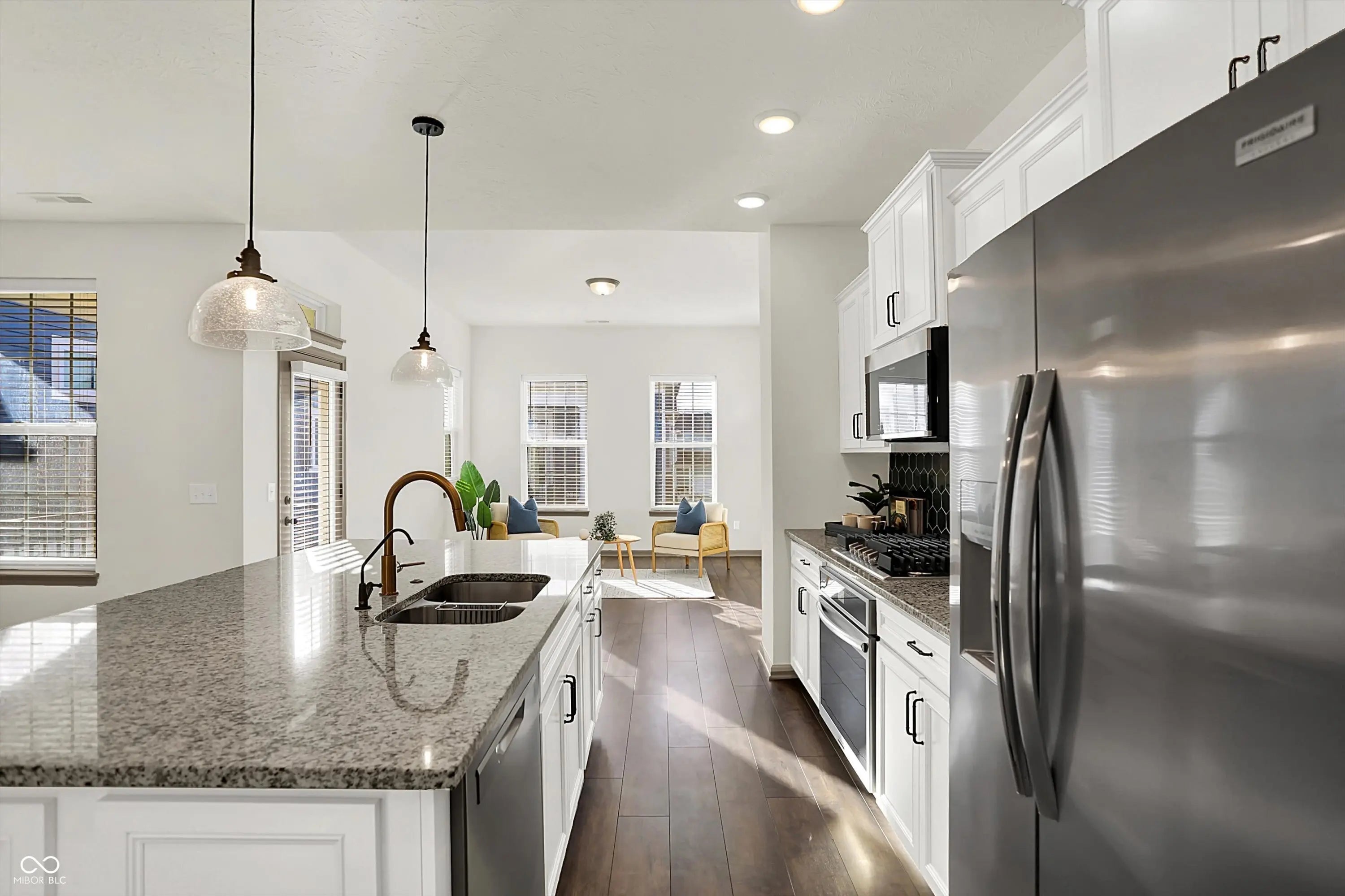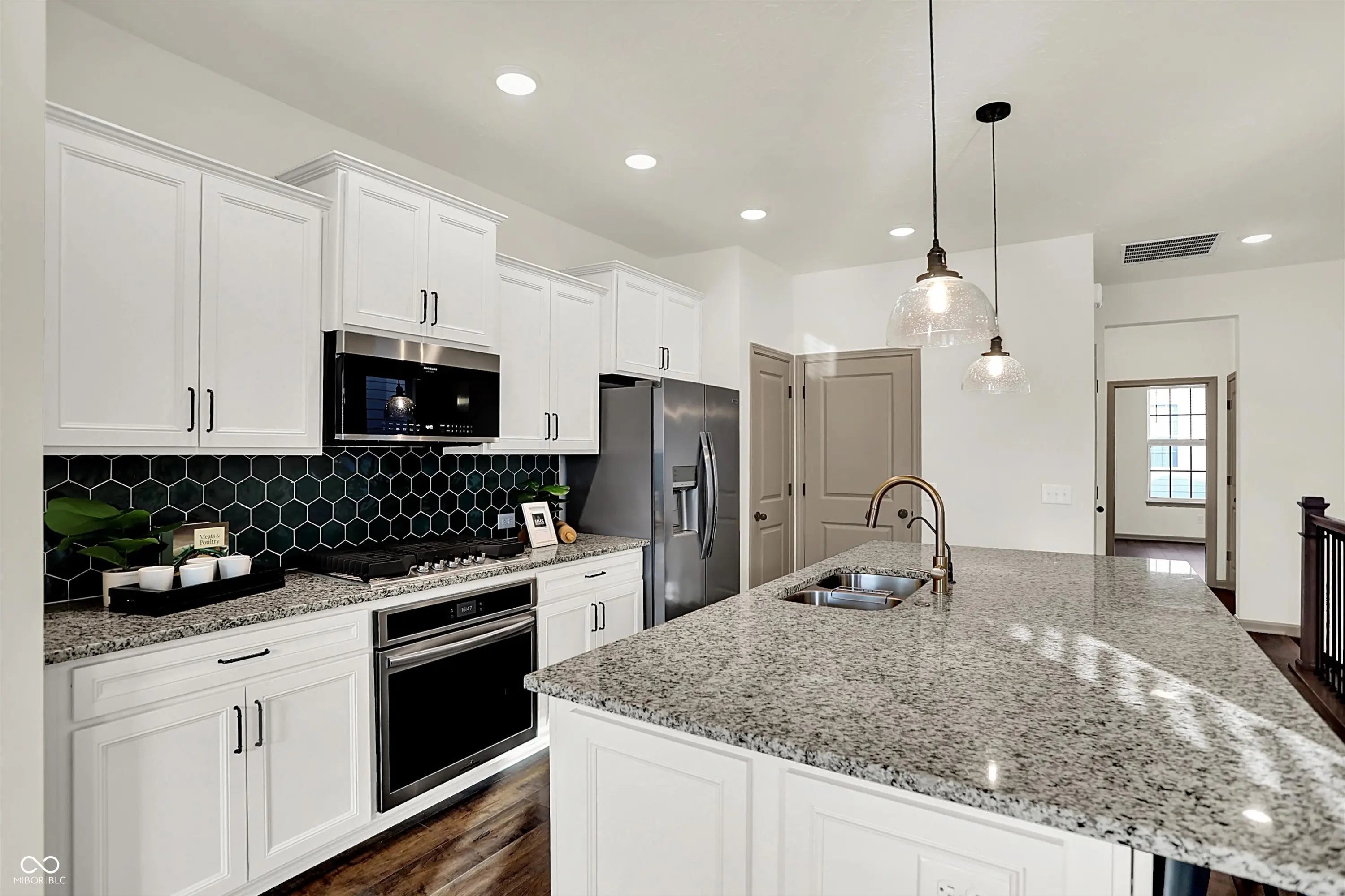Nearly new and full of thoughtful upgrades, this home is move-in ready with style and comfort in mind. The established, manageable yard and window treatments mean you can settle right in and start enjoying the space. On the main floor, you'll find a comfortable bedroom with full bath, plus a flexible room that adapts to your needs-perfect as an office, workout space, art studio, or craft room, and easily convertible into a third bedroom if desired. Upstairs you'll find upgraded cabinets, an oversized island (larger than others in the same floorplan), a spectacular tiled backsplash, stainless steel appliances, and granite counters to create a show-stopping kitchen. Durable laminated wood floors flow throughout-no carpet to worry about. The primary suite is a true retreat with a gorgeous tiled walk-in shower, upgraded cabinets, dual walk-in closets, and a separate water closet for added privacy. A water softener is included for everyday comfort. Additional features include a 2-car attached garage, neighborhood pool, and sidewalks for easy strolls. Just 1 mile from Carmel's thriving downtown, you'll have quick access to restaurants, shopping, the Monon Trail, and the Arts District.