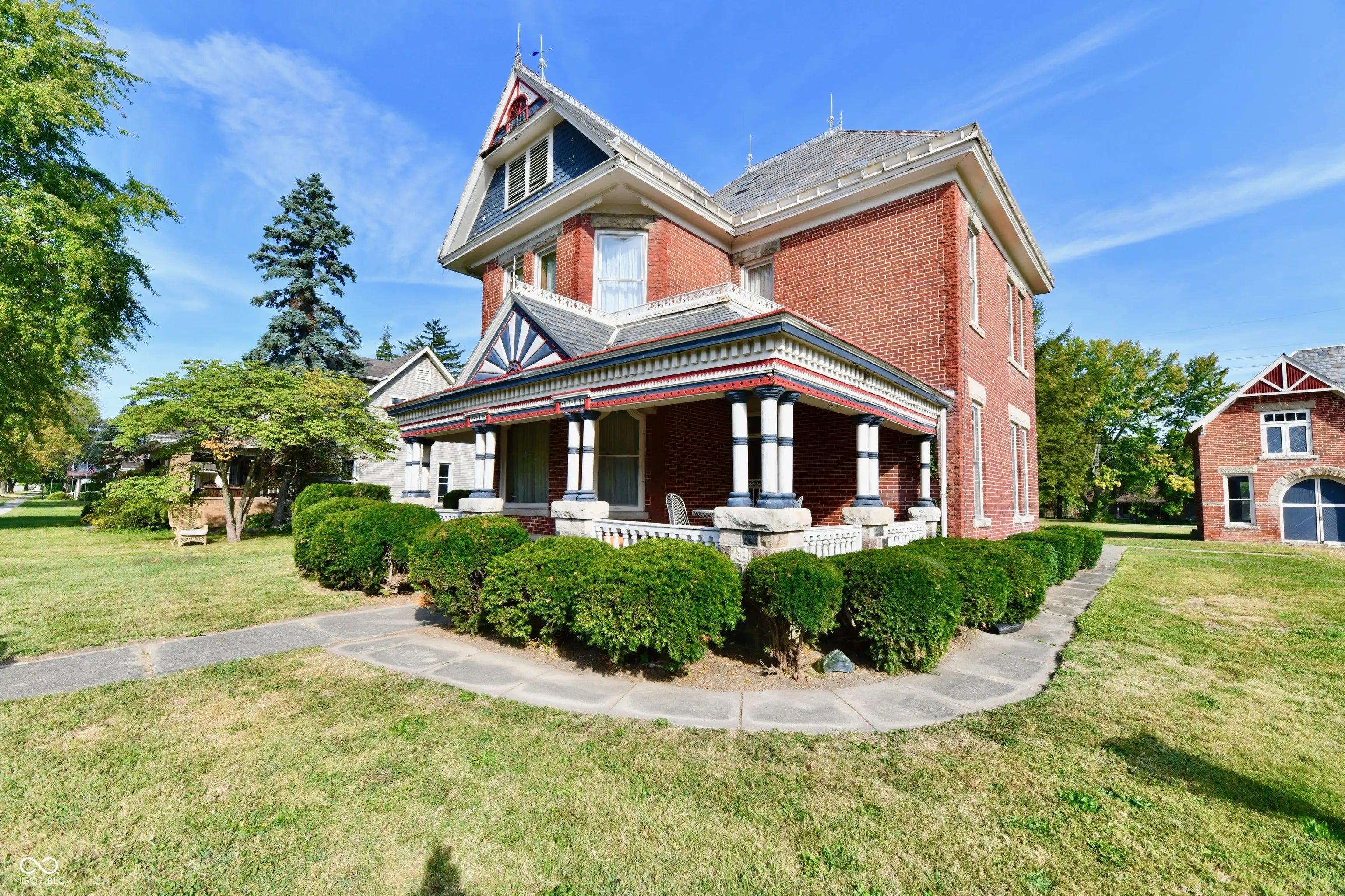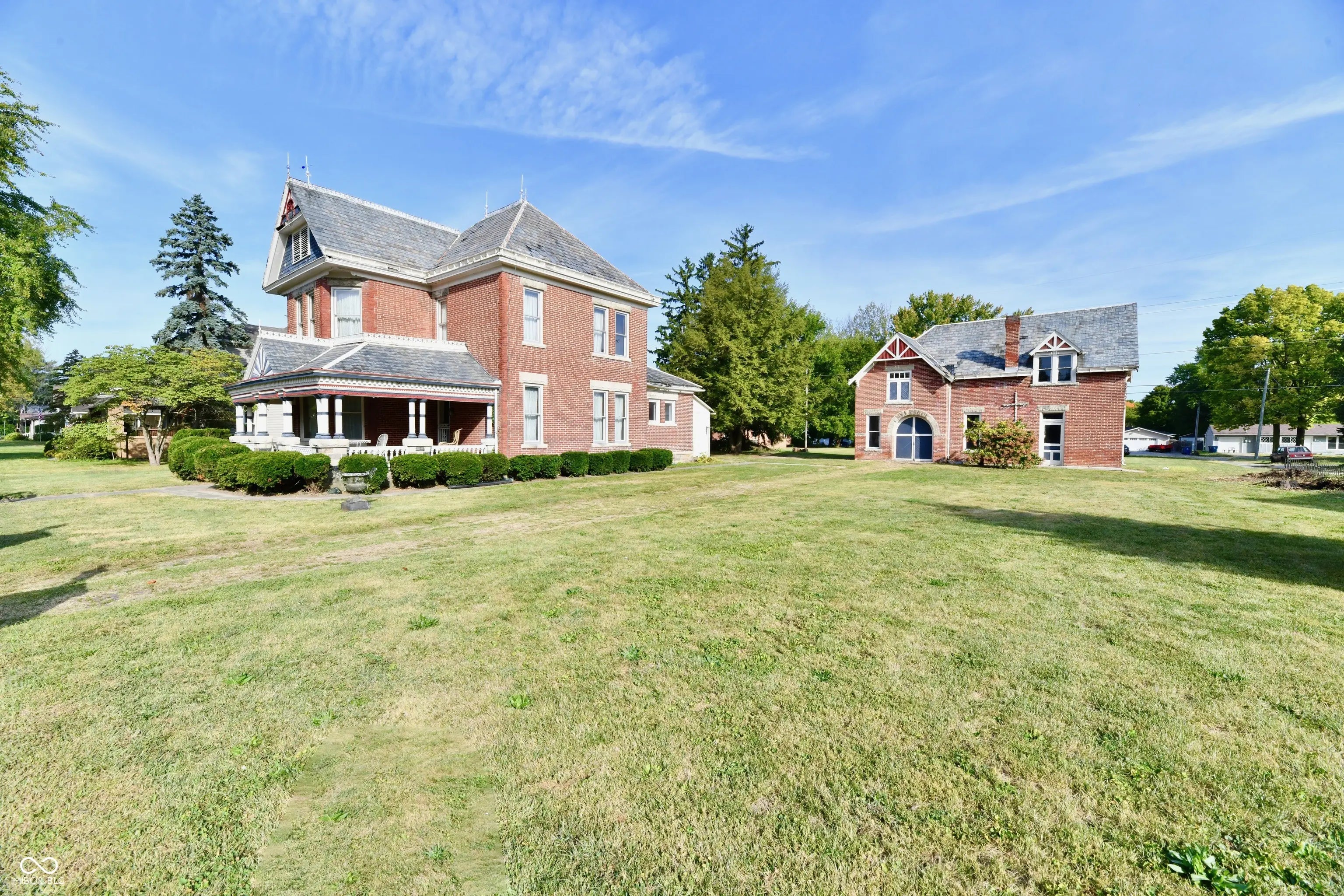 The Crown Jewel of Northern Hamilton County! This is a once in a lifetime opportunity to own an exquisite all brick Victorian beauty situated on 1.36 private acres in small town America. Enjoy coffee and cocktails on the front porch of your dreams while visiting with passing neighbors on Main Street, USA. You'll think you've stepped back in time when you see how beautifully preserved the woodwork and all the details of this home are. Step into the rich foyer adorned with fabulous woodwork and an exquisite staircase. The front parlor with fireplace is filled with light and charming woodwork from yesteryear. The pocket doors usher you into the fantastic living room with corner fireplace and lots of large windows. The primary bedroom is on the main floor with an adjacent bathroom featuring a jetted tub. The upstairs features two gorgeous bedrooms, one of them adjoins a large attic space which could convert to a bathroom and large closet. The charming upstairs sitting room could possibly convert to a fourth bedroom by converting the adjacent hall closet. The huge attic space with stairs from the sitting room could be finished as a playroom or other bedroom suites. The large eat-in kitchen adjoins the main floor laundry room. The seller is leaving the appliances for your convenience. The two-story all brick carriage house with fireplace is so unique and stands ready to embrace your dreams. A garage, living area, recreational area or you decide. This well built home offers endless possibilities to make the quality and charm of yesteryear into a one-of-a-kind 2025 dream home. There's no place like home and a home like this is a unique treasure.