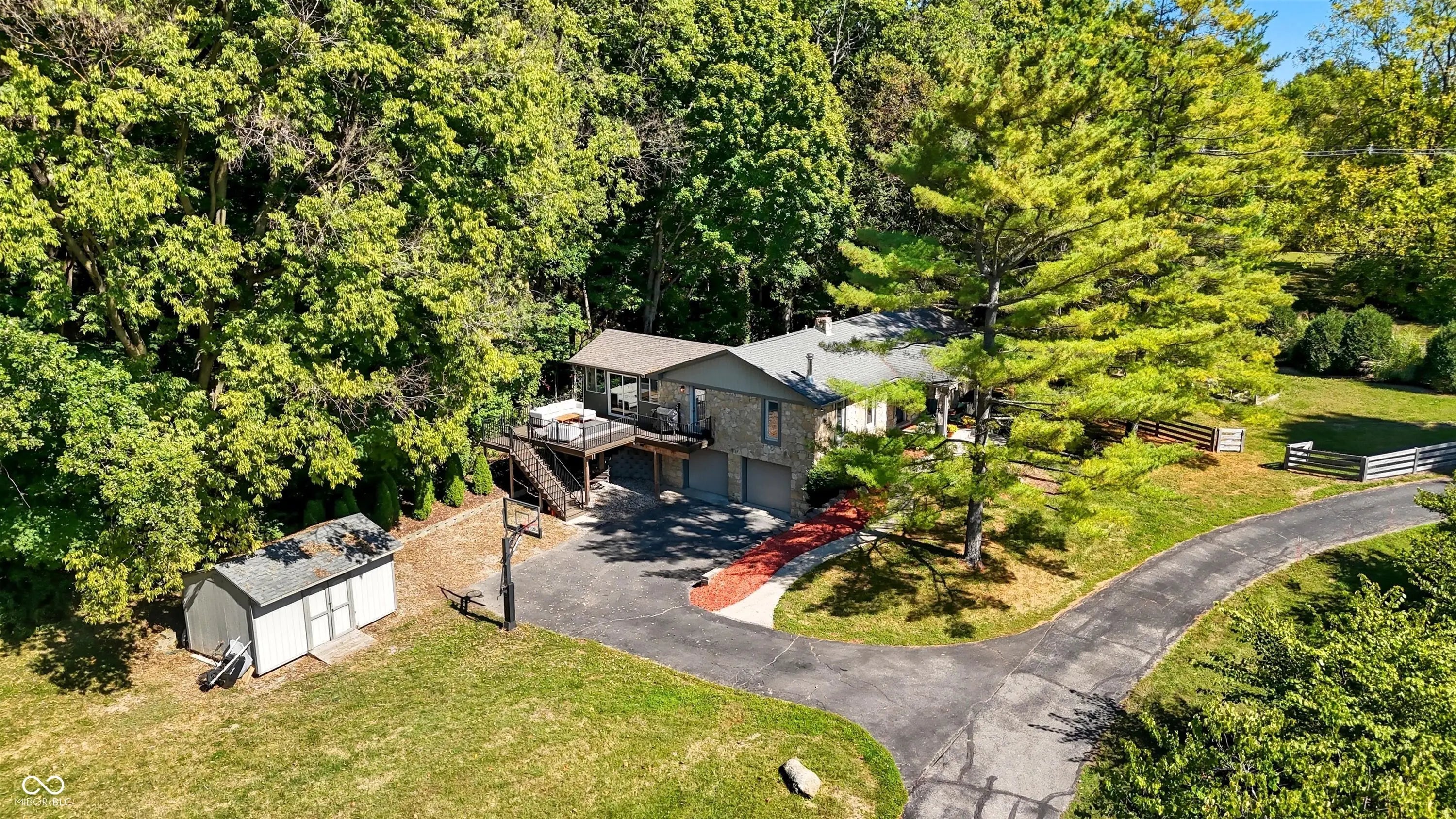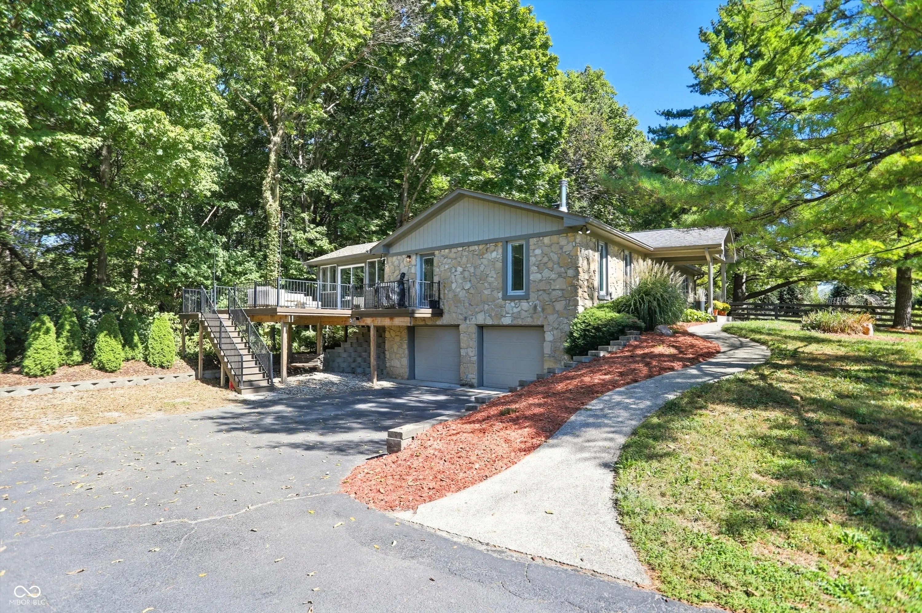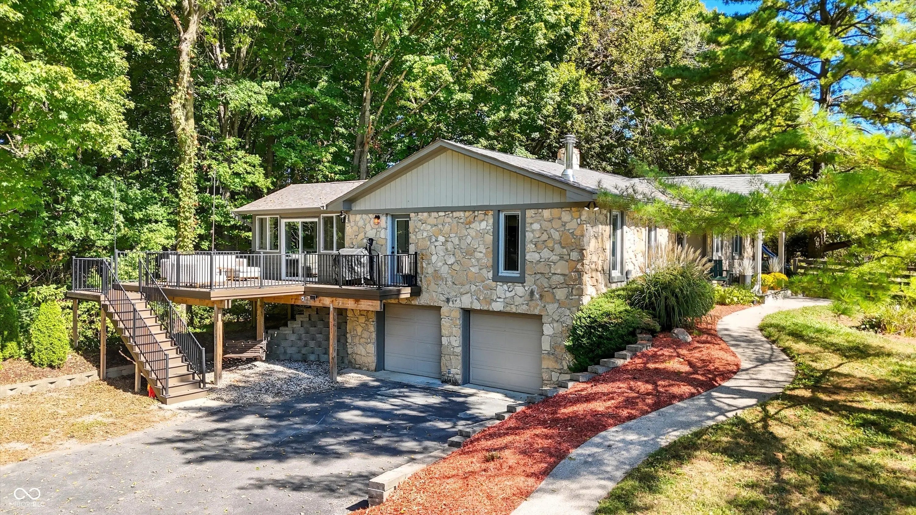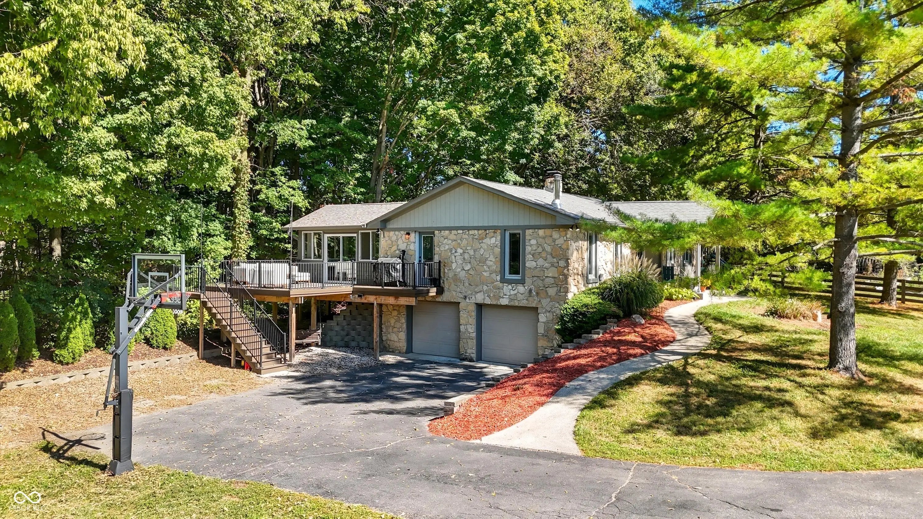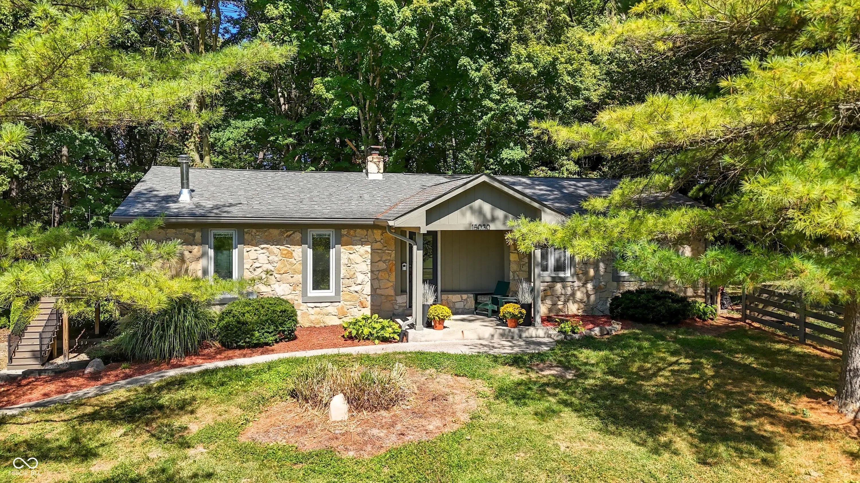 Country charm with modern updates! NO HOA, just peace and quiet from the busy day. Enjoy privacy and natural beauty just minutes from everything, including schools, shopping, and dining. Surrounded by mature trees with Little Eagle Creek and a private pond next door, this setting is truly one of a kind. Home features include an updated kitchen with new quartz countertops and an island, refreshed bathrooms, LVP flooring throughout, newer Andersen windows with built-in blinds, and a nature-filled sunroom with panoramic views of the trees. The living room offers a cozy electric fireplace, while the finished basement provides versatile space for entertaining, a TV room, playroom-or even a home gym-with convenient laundry and storage. Step outside to a low-maintenance composite deck with wrought iron railings, a fully fenced side yard, and a mini barn. Recent updates include a new reverse osmosis system & UV water system, new dishwasher, exterior paint, new light fixtures, updated kitchen with quartz countertops, and more. Enjoy the best of both worlds-nature and convenience-all in one property!