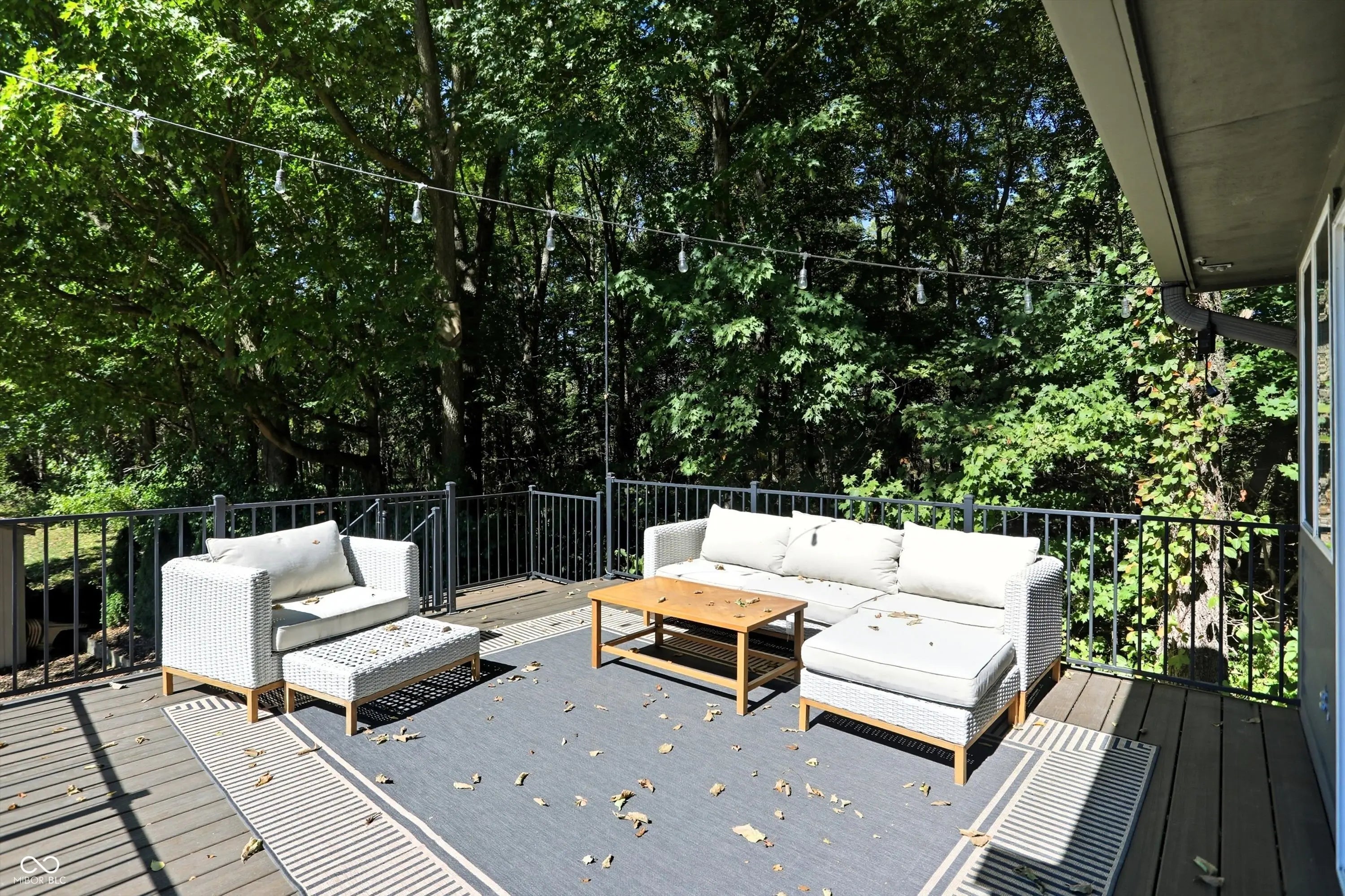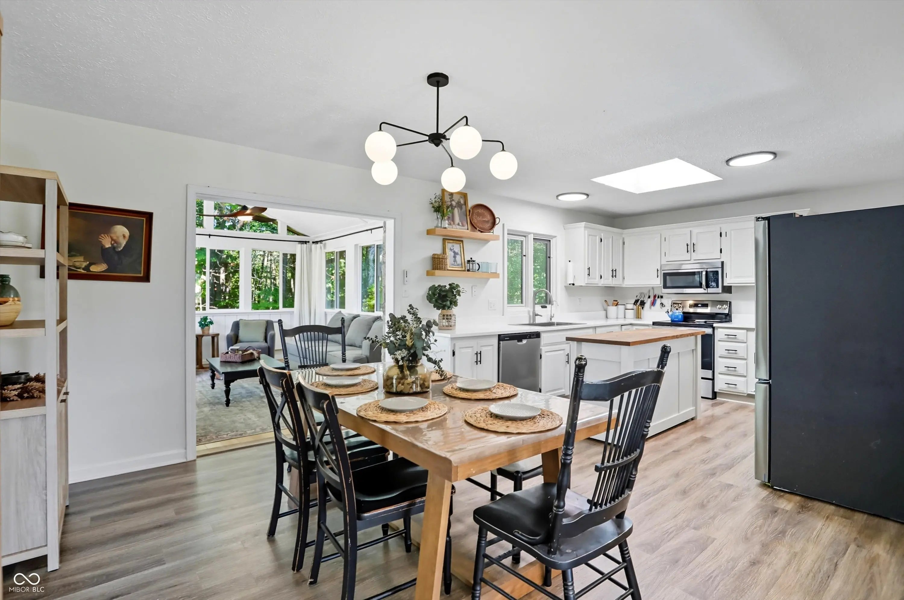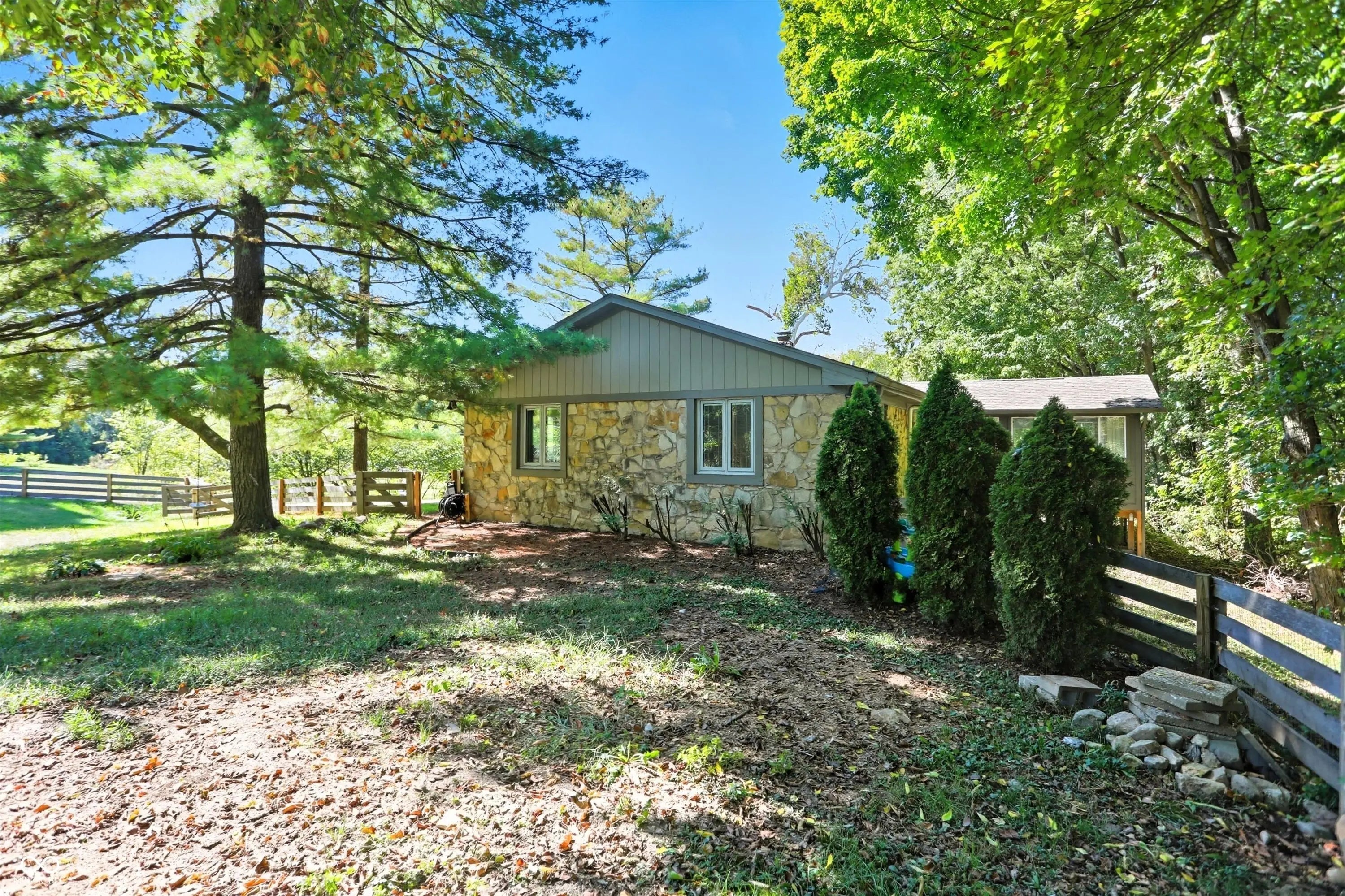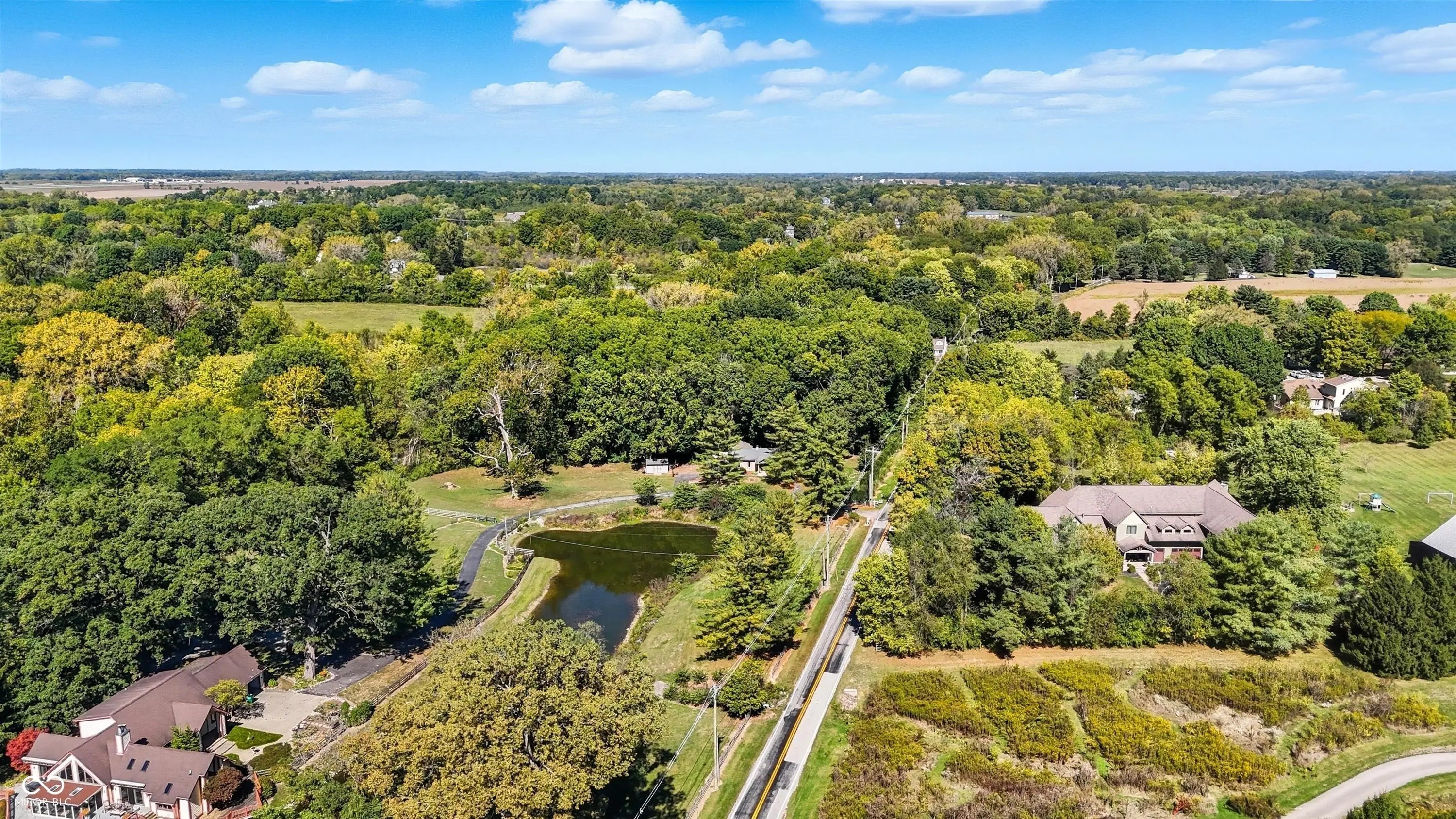 Country charm with modern updates! NO HOA, just peace and quiet from the busy day. Enjoy privacy and natural beauty just minutes from everything, including schools, shopping, and dining. Surrounded by mature trees with Little Eagle Creek and a private pond next door, this setting is truly one of a kind. Home features include an updated kitchen with new quartz countertops and an island, refreshed bathrooms, LVP flooring throughout, newer Andersen windows with built-in blinds, and a nature-filled sunroom with panoramic views of the trees. The living room offers a cozy electric fireplace, while the finished basement provides versatile space for entertaining, a TV room, playroom-or even a home gym-with convenient laundry and storage. Step outside to a low-maintenance composite deck with wrought iron railings, a fully fenced side yard, and a mini barn. Recent updates include a new reverse osmosis system & UV water system, new dishwasher, exterior paint, new light fixtures, updated kitchen with quartz countertops, and more. Enjoy the best of both worlds-nature and convenience-all in one property!