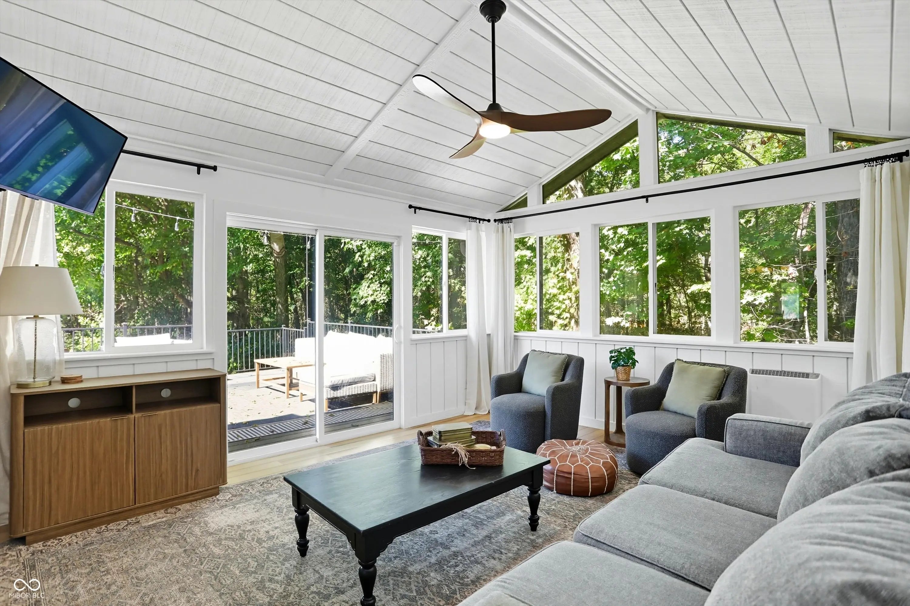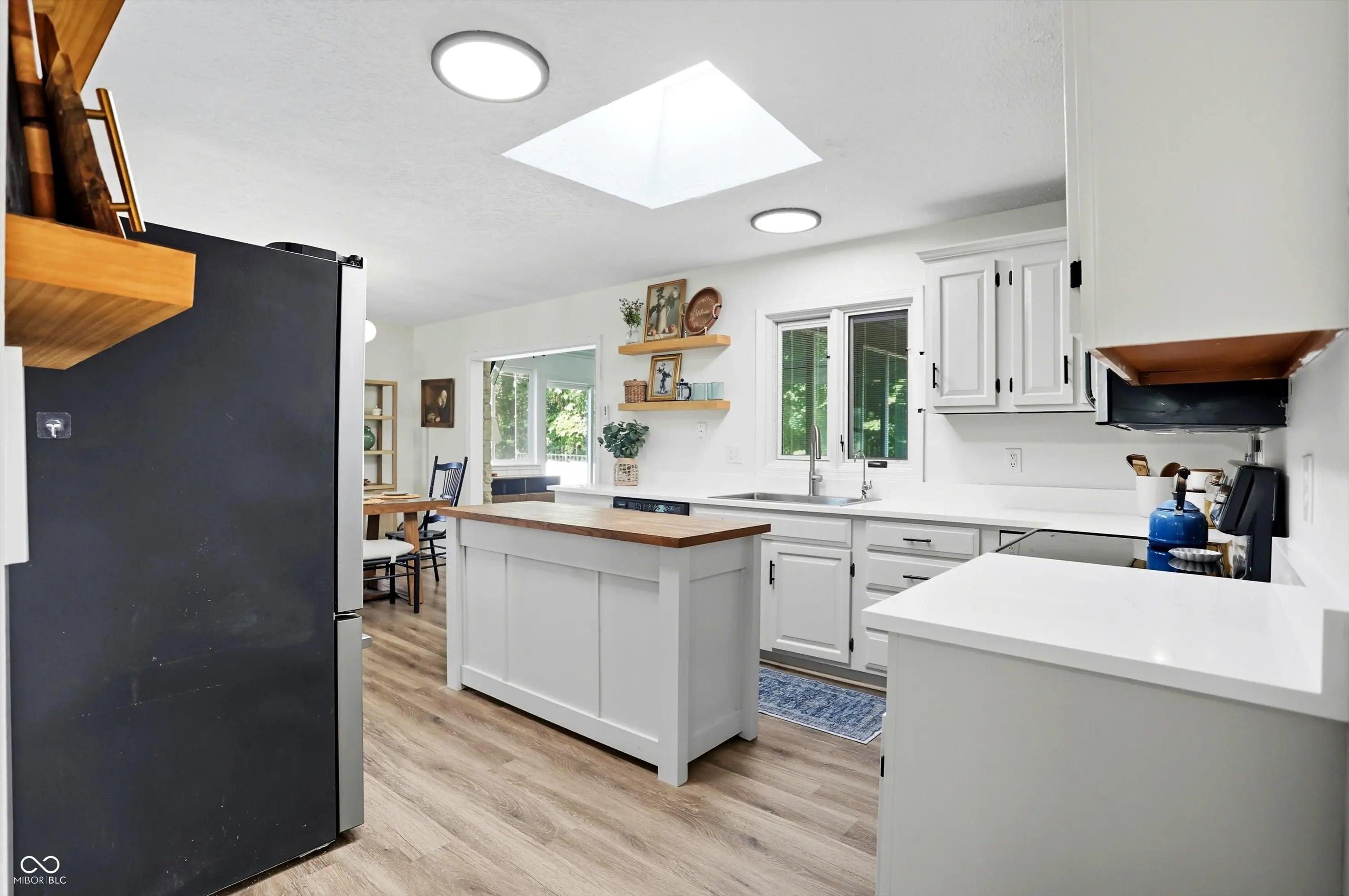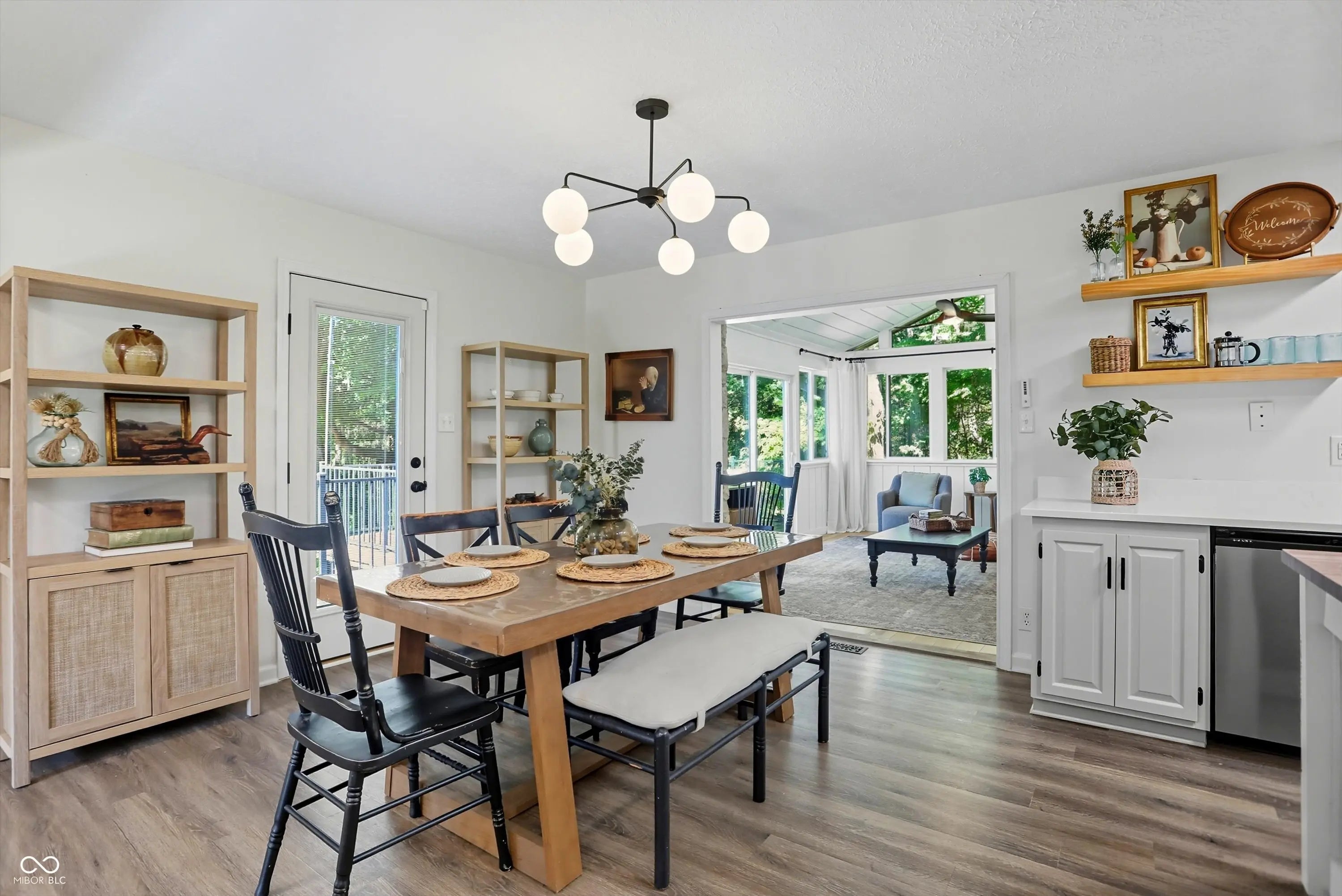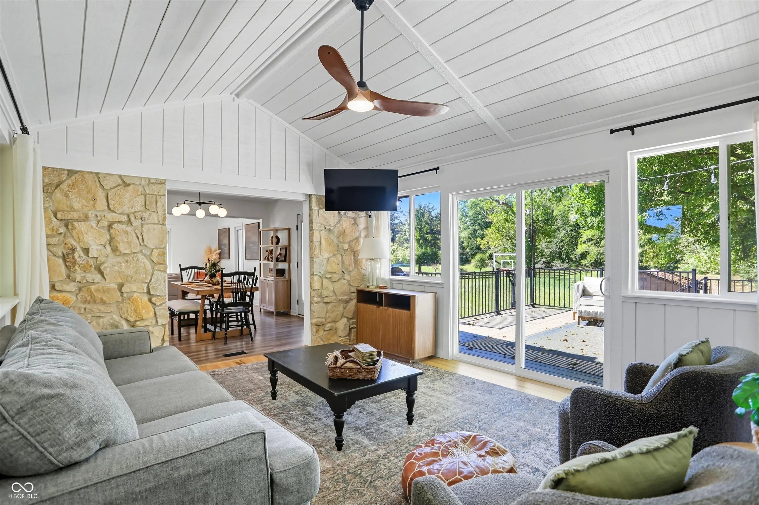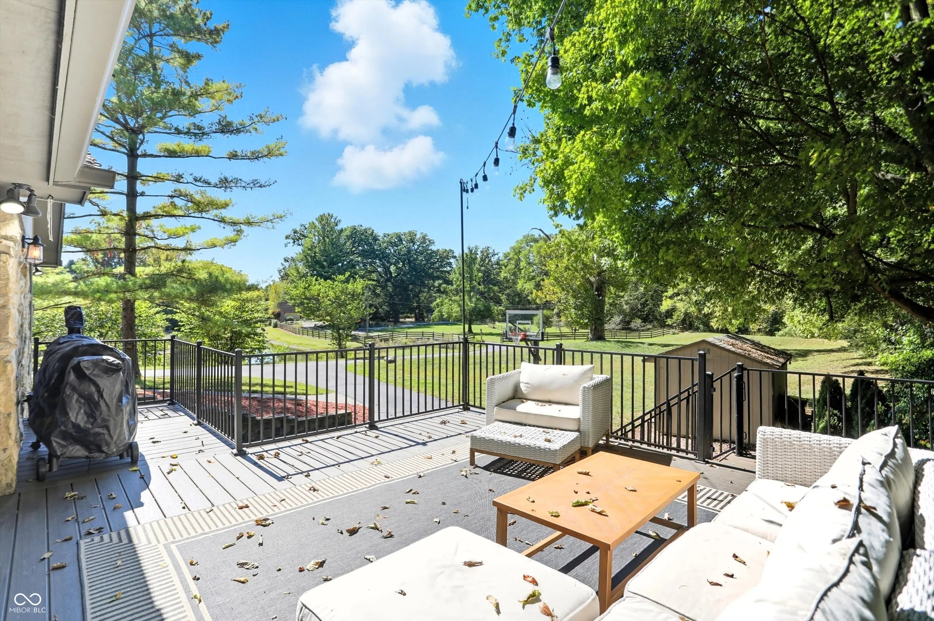 Country charm with modern updates! NO HOA, just peace and quiet from the busy day. Enjoy privacy and natural beauty just minutes from everything, including schools, shopping, and dining. Surrounded by mature trees with Little Eagle Creek and a private pond next door, this setting is truly one of a kind. Home features include an updated kitchen with new quartz countertops and an island, refreshed bathrooms, LVP flooring throughout, newer Andersen windows with built-in blinds, and a nature-filled sunroom with panoramic views of the trees. The living room offers a cozy electric fireplace, while the finished basement provides versatile space for entertaining, a TV room, playroom-or even a home gym-with convenient laundry and storage. Step outside to a low-maintenance composite deck with wrought iron railings, a fully fenced side yard, and a mini barn. Recent updates include a new reverse osmosis system & UV water system, new dishwasher, exterior paint, new light fixtures, updated kitchen with quartz countertops, and more. Enjoy the best of both worlds-nature and convenience-all in one property!
