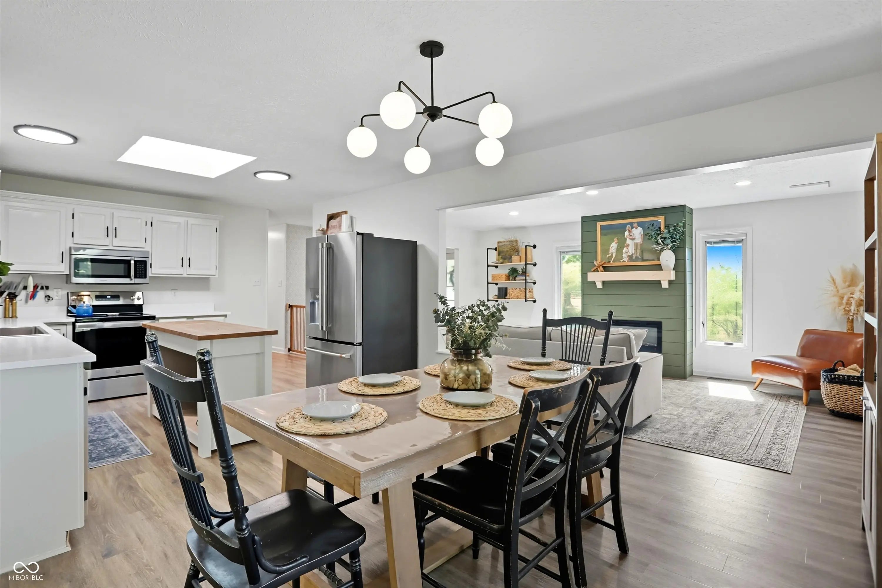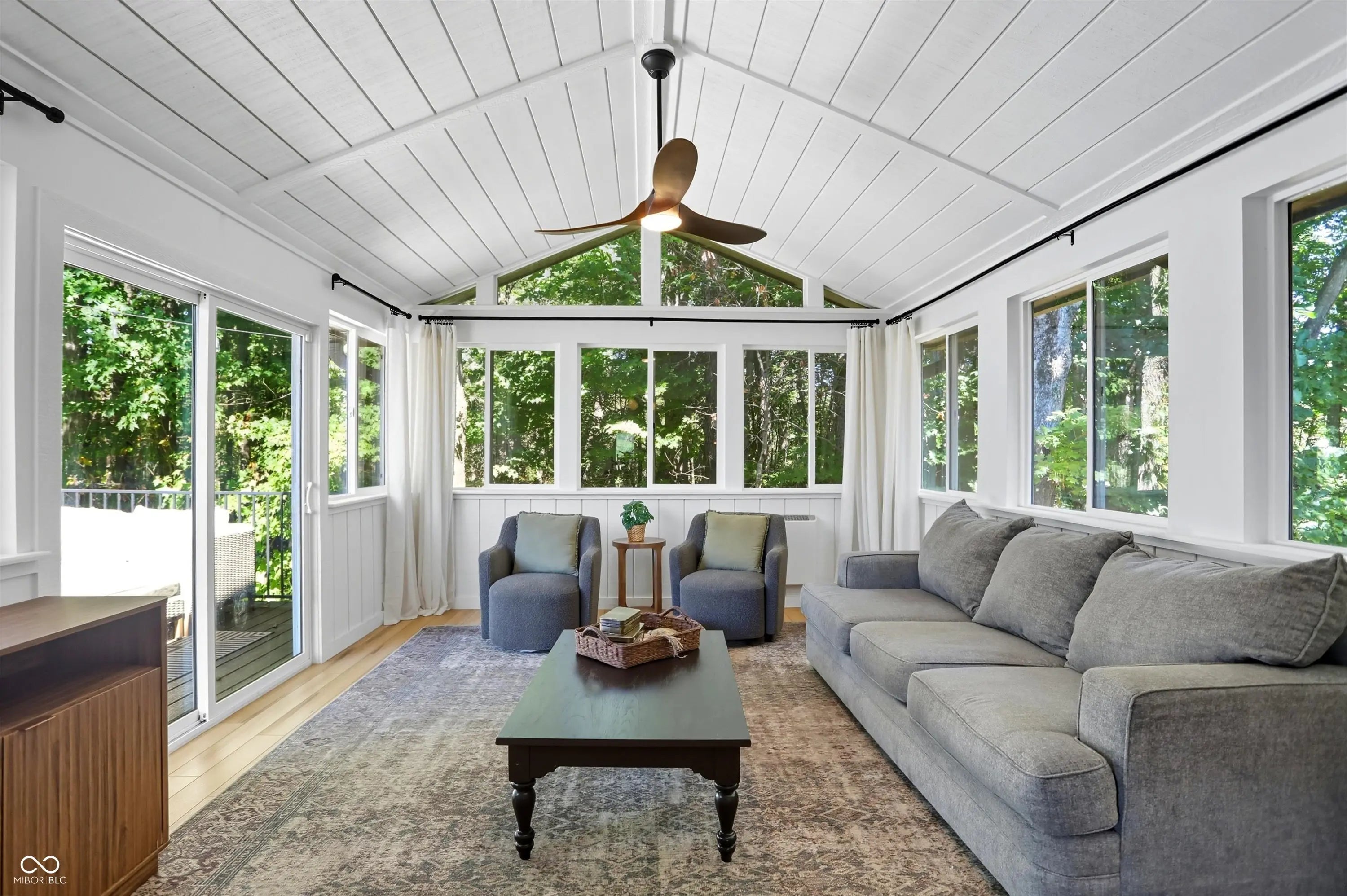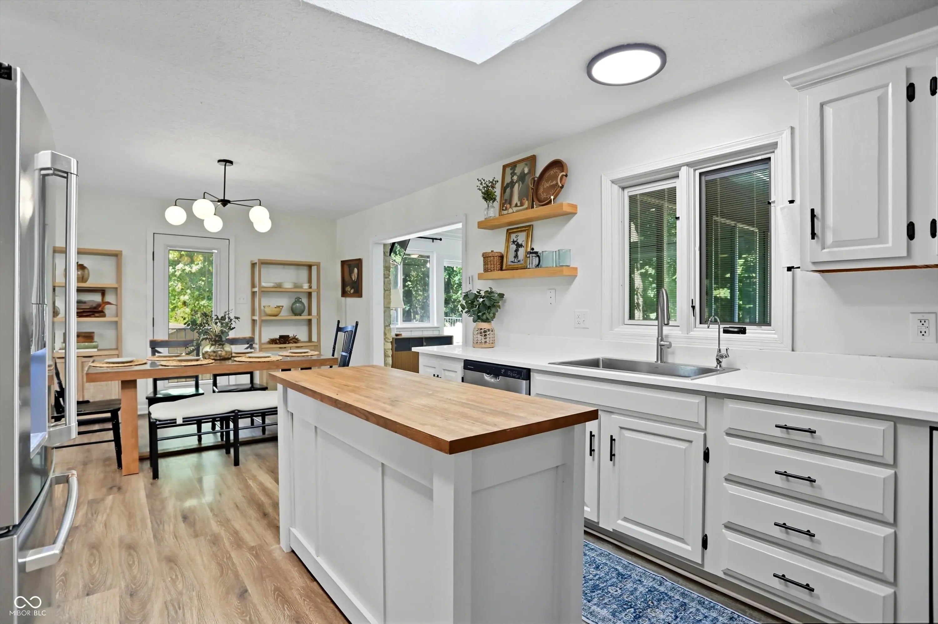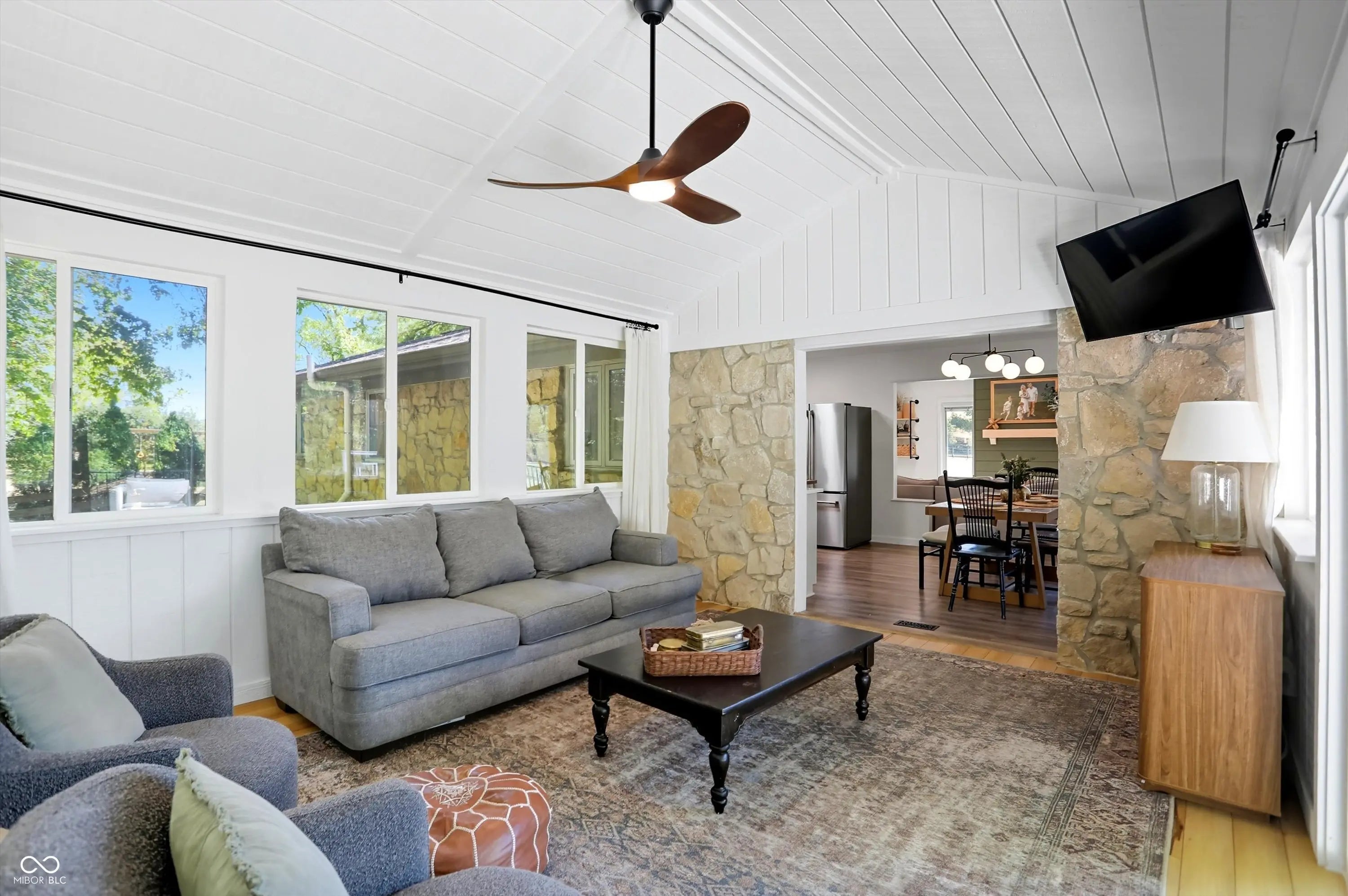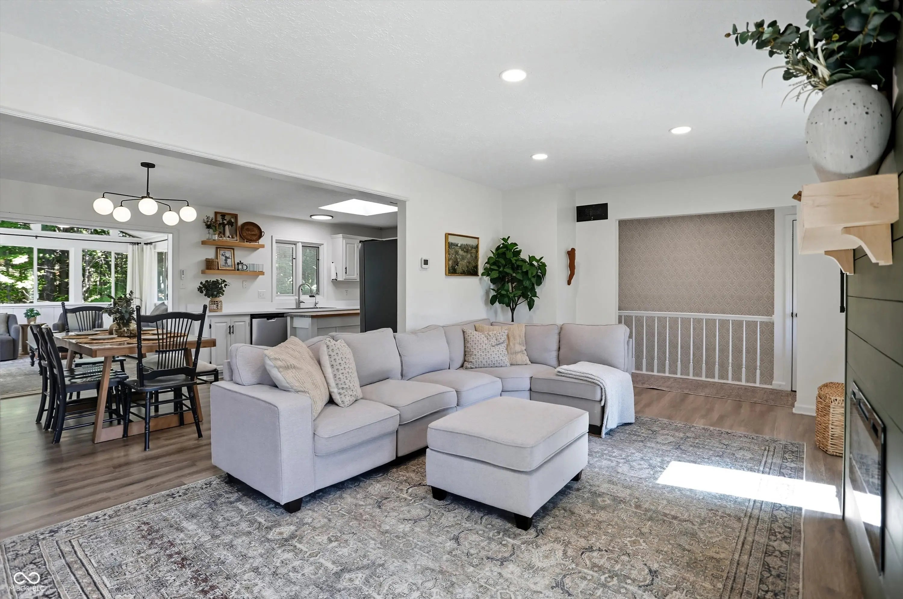 Country charm with modern updates! NO HOA, just peace and quiet from the busy day. Enjoy privacy and natural beauty just minutes from everything, including schools, shopping, and dining. Surrounded by mature trees with Little Eagle Creek and a private pond next door, this setting is truly one of a kind. Home features include an updated kitchen with new quartz countertops and an island, refreshed bathrooms, LVP flooring throughout, newer Andersen windows with built-in blinds, and a nature-filled sunroom with panoramic views of the trees. The living room offers a cozy electric fireplace, while the finished basement provides versatile space for entertaining, a TV room, playroom-or even a home gym-with convenient laundry and storage. Step outside to a low-maintenance composite deck with wrought iron railings, a fully fenced side yard, and a mini barn. Recent updates include a new reverse osmosis system & UV water system, new dishwasher, exterior paint, new light fixtures, updated kitchen with quartz countertops, and more. Enjoy the best of both worlds-nature and convenience-all in one property!