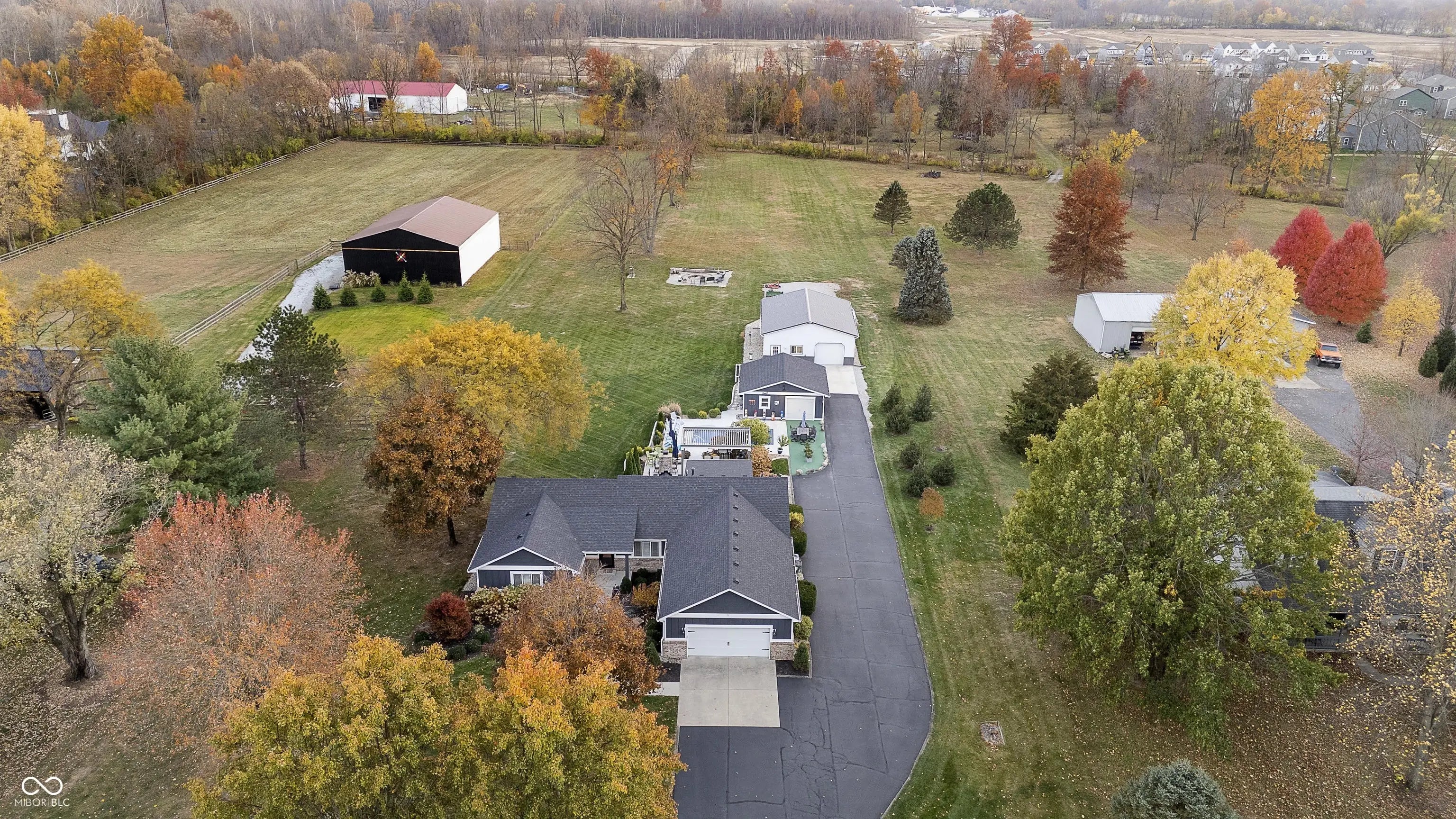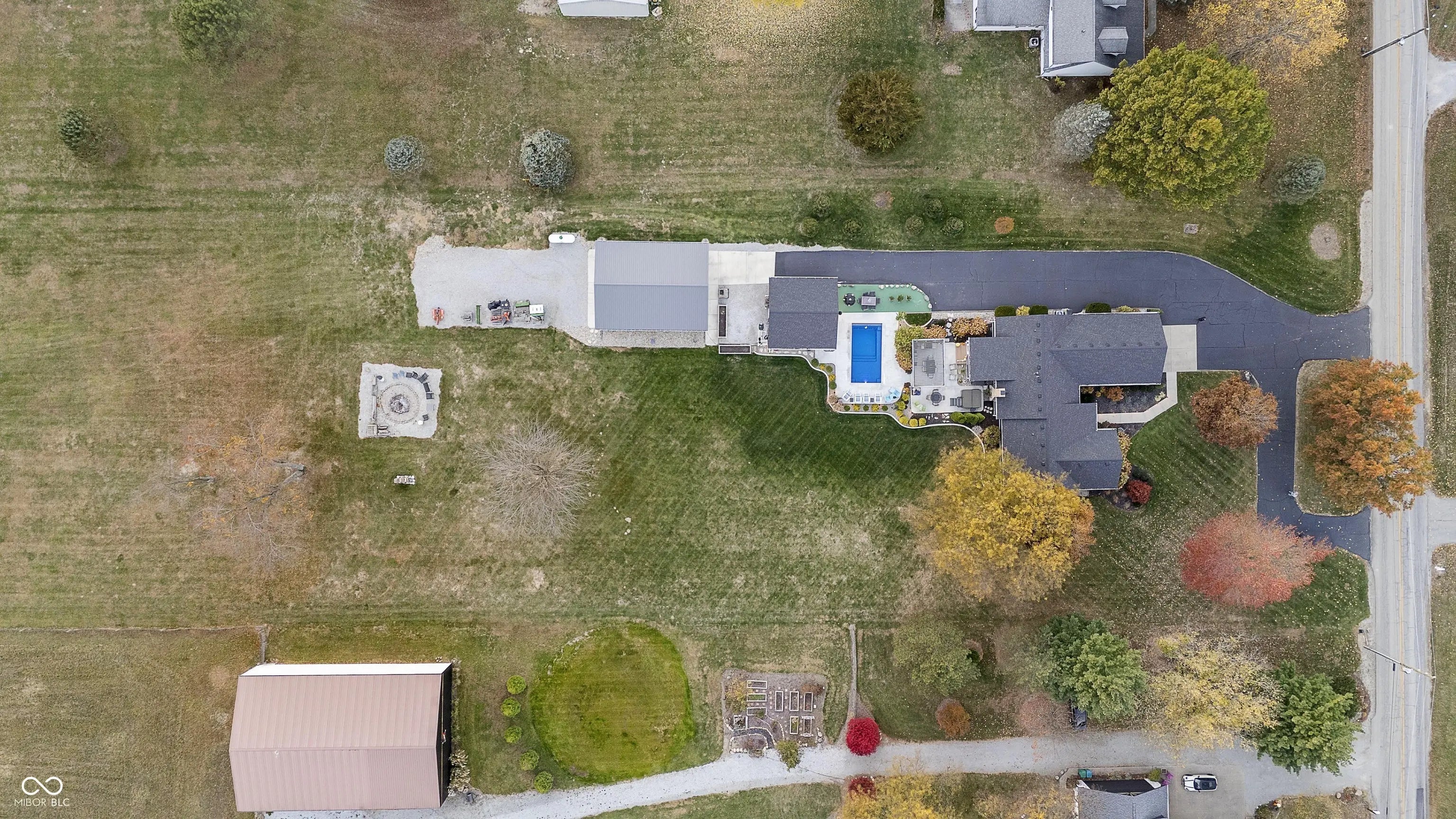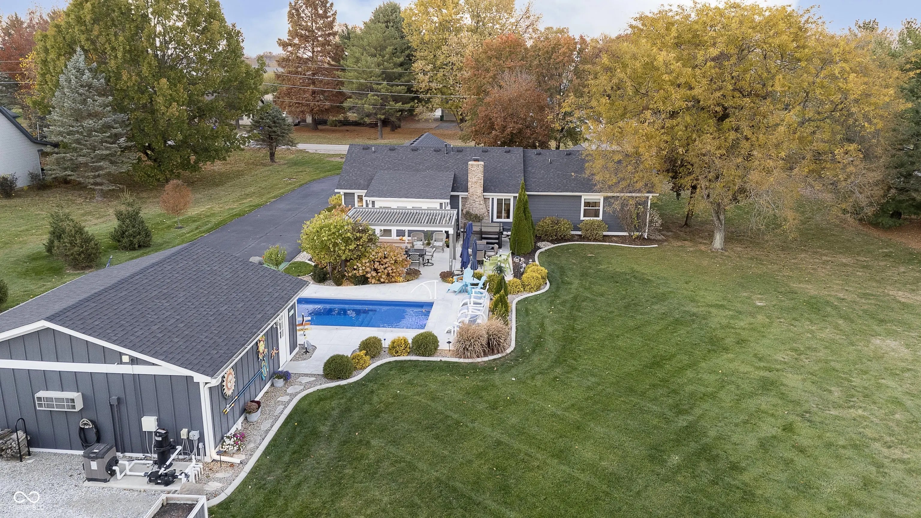 This exceptional estate offers a rare and diverse live, play, work opportunity, combining a meticulously upgraded residence with a newly installed swimming pool, an entertainers' dream patio, multiple out buildings, as well as a tree lined stream. Inside, the home is a showcase of modern efficiency and smart technology. The kitchen and laundry are anchored by a 2025 LG dishwasher with WIFI, a 2022 LG French door fridge with WIFI, and a suite of 2023-2024 Whirlpool gas appliances. Critical infrastructure has been fully modernized, including a 2019 Carrier Hybrid HVAC, a 2023 Vesta tankless gas water heater, and a 2021 Culligan water softener. The exterior boasts 2019 LP Smartside siding, a newer roof, 6" gutters, and updated windows. With 2022 ADT Security and 2018 insulated garage doors on both the house and detached structures, this property is as secure and efficient as it is beautiful. Ideal for a small business owner, the 40 x 30 2023 pole barn features a professional grade concrete floor, two electric overhead doors for equipment access, two pedestrian doors, and six windows providing ample natural light for a workshop or office. Complementing this is a 24x24 building, heated and cooled and completely renovated in 2023 into a picture perfect high end pool house & sports cave. This fully insulated space includes an epoxy quartz floor, a full kitchen, a full bath, an 18 gallon water heater, and a dedicated HVAC PTAC system, offering a private, climate-controlled environment for clients or guests. The outdoor living space was transformed in 2024 featuring a fiberglass inground saltwater heated pool and a 12x18 Smart Pergola over the patio. Relaxation is a priority with the 2020 Viking Legacy Spa, which includes integrated Bluetooth speakers. The entire backyard is framed by 2024 professional landscaping, including new trees, shrubs, and concrete edged curbs for a clean, polished look. Pool House 576 additional sq ft. Pole Barn additional 1,200 sq ft.
