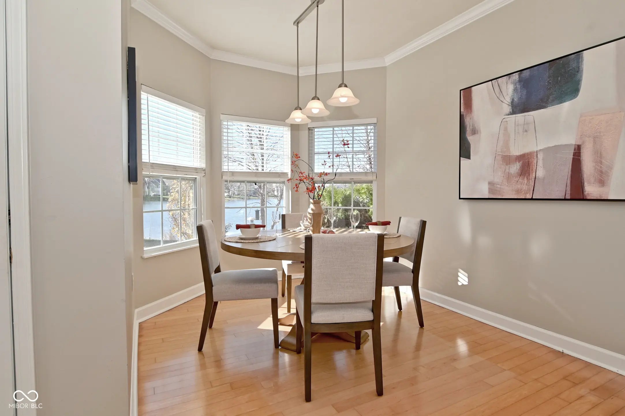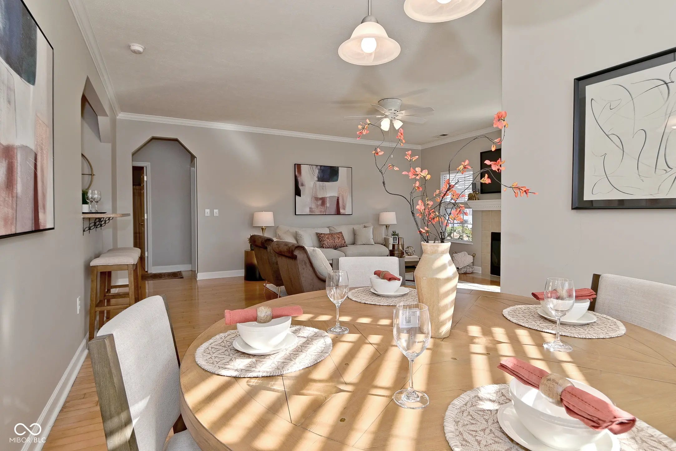 Enjoy stunning water views from your private front porch in this rare ground-floor condo located in Carmel. This move-in-ready 3-bedroom, 2-bath home boasts a spacious open floor plan with hardwood floors throughout, except for one bedroom with plush carpeting and a large storage closet. The well-designed kitchen has updated solid surface countertops, a new refrigerator and dishwasher (both new within the last year), a pantry closet, a smooth top stove, and a new microwave hood. The huge master suite offers a serene pond view, a walk-in closet, and an en-suite bath with double sinks, a walk-in shower, and a linen closet. Additional highlights include a 2-car extended garage with epoxy flooring, utility sink, and ample storage, a back hallway and laundry closet off the garage-perfect for a mudroom area, a gas fireplace in the family room, and an open dining space with a bay window perfect for enjoying the water view. Enjoy the neighborhood's scenic walking trail leading to the Monon Trail, as well as a wealth of HOA amenities: pickleball, tennis courts, basketball area, fitness center, pool, and clubhouse. The building has a newer roof and fresh exterior paint. All appliances, including the washer, dryer, and water softener, are included. Don't miss this rare opportunity to own a water-view condo with no stairs in Carmel!