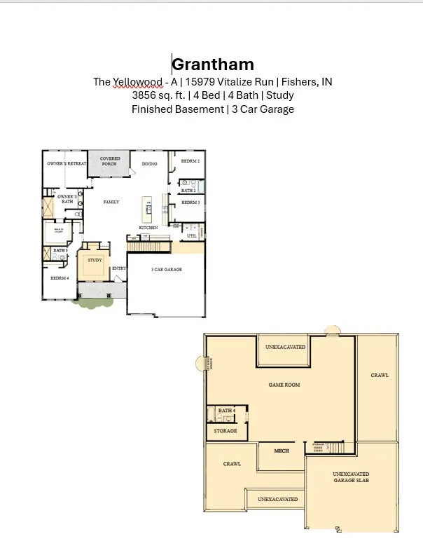 Discover the perfect blend of comfort and style with this new David Weekley home in Grantham of Fishers. The Yellowood floor plan offers open-concept living with a stunning kitchen featuring quartz countertops, soft-close cabinetry, and stainless-steel appliances. Laminate wood flooring flows through bright, spacious living areas, complemented by a private study with French doors and a finished lower-level gameroom with full bath. The luxurious Owner's Retreat includes a super shower, dual vanities, and a large walk-in closet. Enjoy peaceful evenings on the extended covered rear porch. Residents of Grantham enjoy resort-style amenities including a pool, sundeck, basketball court that converts to pickleball, outdoor fireplace, and a gorgeous community lounge. Built with energy-efficient design and backed by David Weekley Homes' industry-leading warranty. Experience exceptional design, lasting quality, and a lifestyle you'll love in the Yellowood at Grantham.