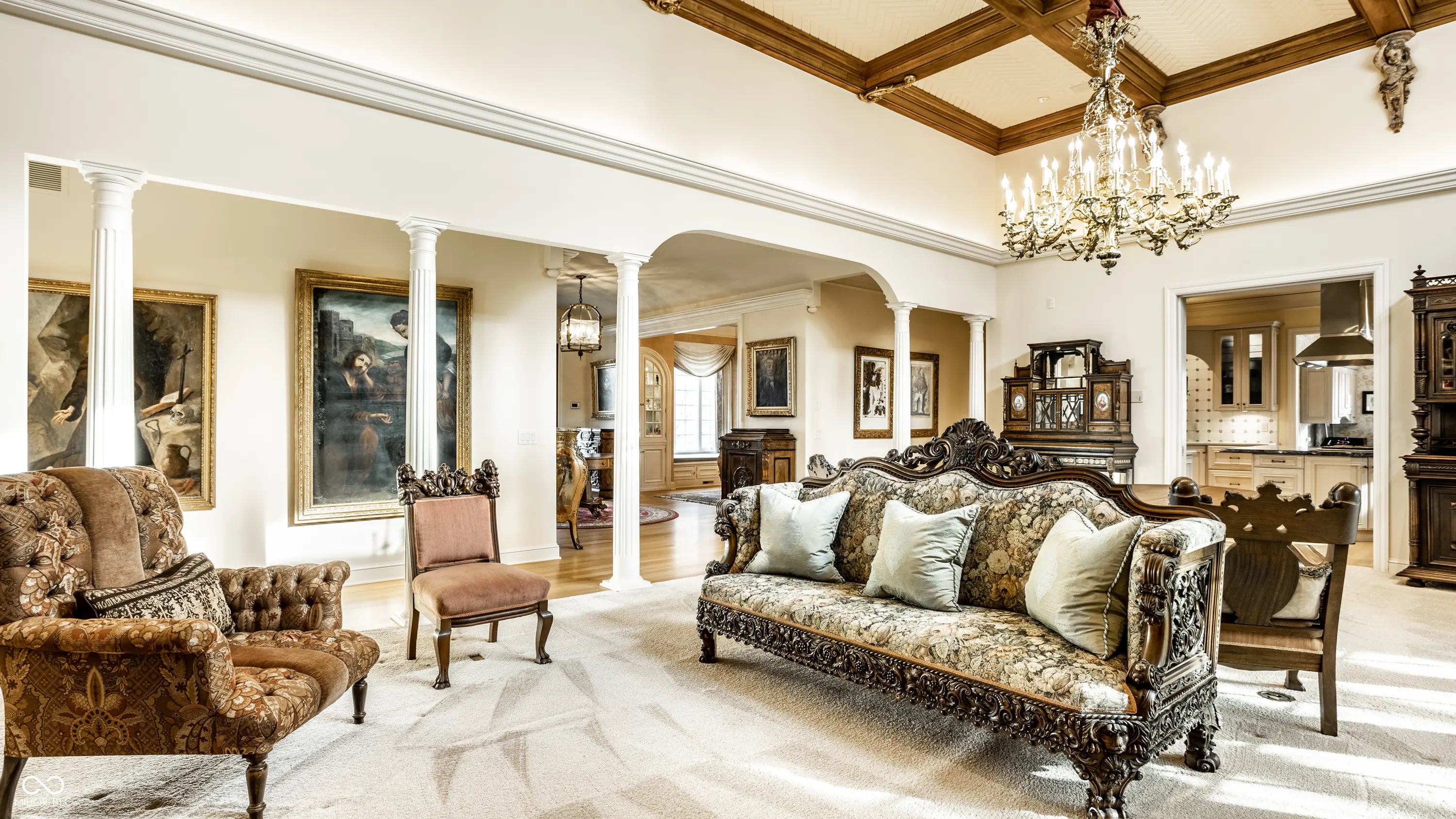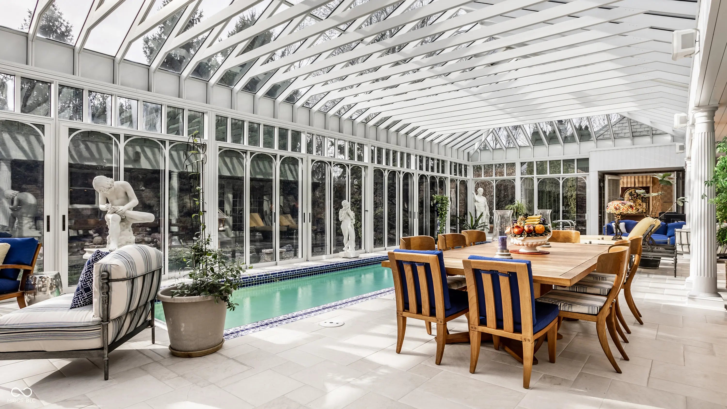 Stately custom home built by R.J. Klein, tucked inside the gated Willowood community and designed for exceptional entertaining and everyday luxury. Set on .89 acres of beautifully landscaped grounds, the outdoor living spaces are truly spectacular, featuring two expansive blue slate patios and a serene recirculating waterfall. Landscaped by Mark Holeman & Co. Offers unique privacy wrapped in mature Spruce trees and evergreens. An Asian inspired waterfall tumbles over boulders into a reflecting pond, surrounded by rock gardens. Enjoy year-round resort-style living in the home's expansive solarium 63x26, complete with a lap pool and wet bar. A grand entry opens to a breathtaking great room with raised coffered ceilings, a fireplace, and a wet bar. The great room flows seamlessly into the gourmet kitchen, which boasts a center island, double ovens with a warming drawer, two dishwashers, and abundant cabinetry. The adjoining breakfast room offers a built-in desk and ample space for a cozy breakfast nook. The main level also includes a richly paneled den with custom built-ins and a formal dining room with built-ins, ideal for elegant entertaining. The primary suite on the main floor is a private retreat, featuring a sitting area and fireplace, along with a spa-like bath complete with dual vanities, a large shower, walk-in closets, and a unique office/spa room that connects to the suite and includes an in-ground spa. The lower level features a spacious rec room plus an unfinished storage/utility area. Upstairs, you'll find two large bedrooms connected by a Jack-and-Jill bath, plus a generous bonus room currently used as a bedroom. This one-of-a-kind home offers an unparalleled lifestyle in one of the area's most desirable gated communities.