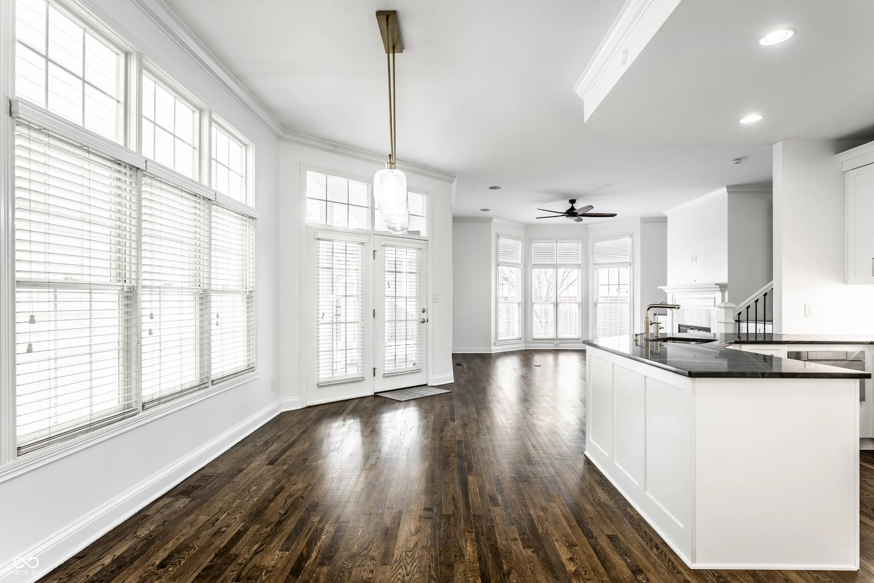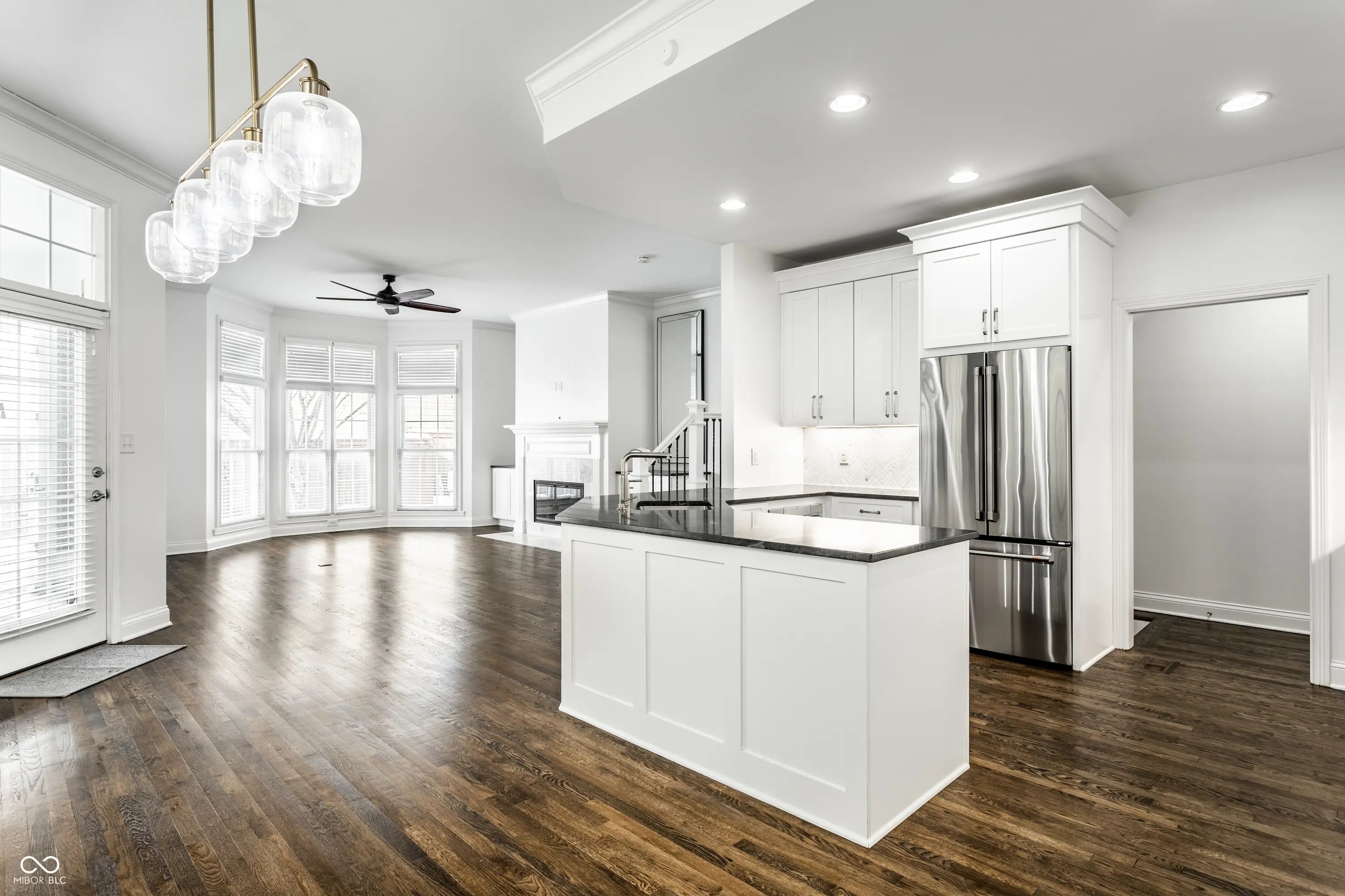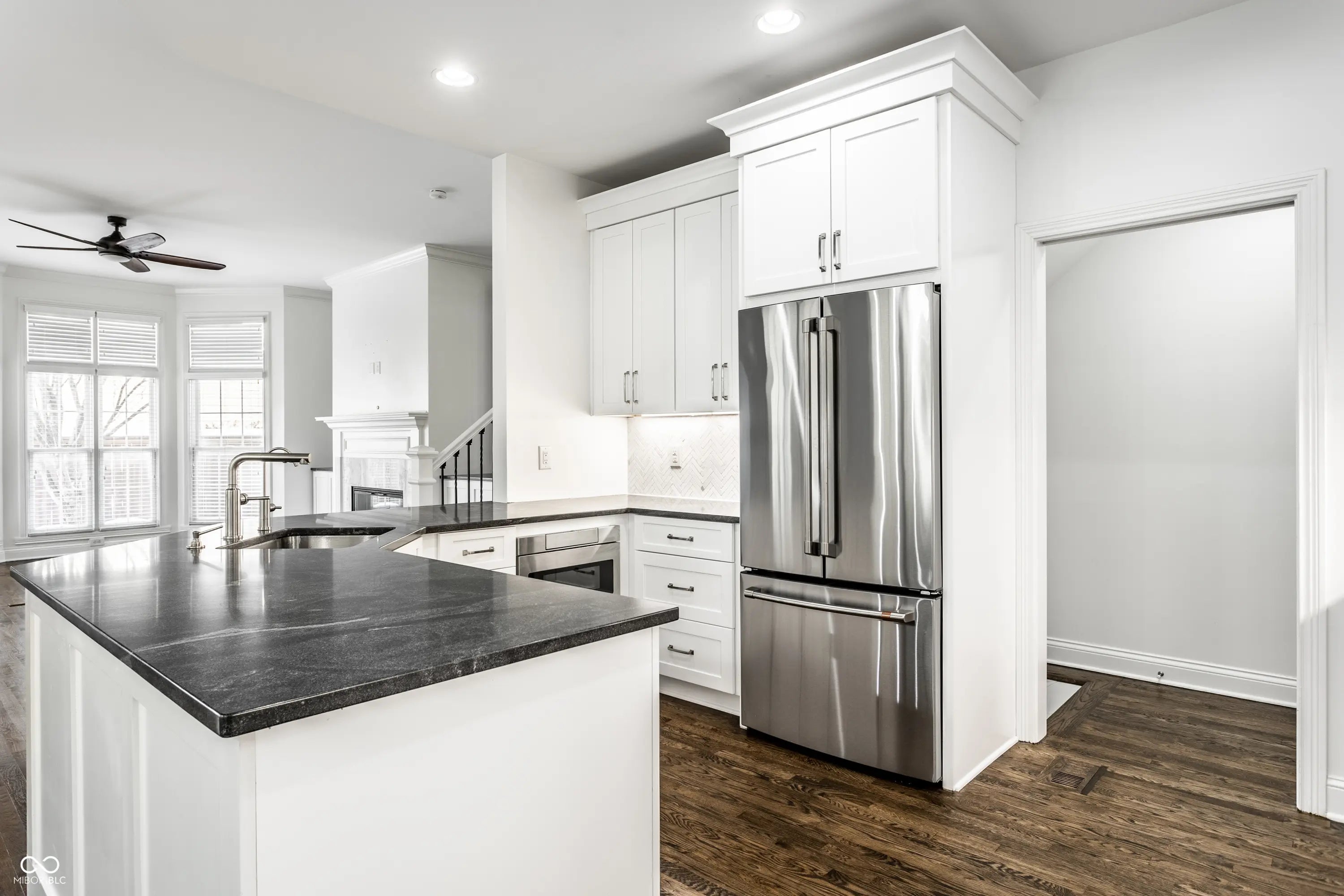 Beautifully remodeled home in the exclusive gated Watermark community in downtown Indianapolis. This move-in ready residence features refinished espresso hardwood floors, designer lighting, and abundant natural light throughout. The stunning living room showcases a new marble fireplace surround, Pottery Barn mirrors, and newly reconfigured stairs with elegant wrought iron spindles. The updated kitchen offers custom soft-close cabinetry with honed granite countertops, GE Cafe appliances, herringbone marble backsplash, pantry pull-outs, and an oversized granite peninsula. Flexible main-level bedroom is ideal for guests or a private home office. The luxurious primary suite features custom walk-in closets, spa-like bath with marble finishes, soaking tub, walk-in shower, and private balcony. An additional upstairs bedroom includes its own ensuite bath and walk-in closet. Finished basement includes a private bedroom, full bath, and kitchenette. Perfect for guests or multi-generational living. Enjoy the maintenance-free Trex deck with front-row seats to Fourth of July fireworks and an unbeatable location at the Canal and on the Monon, within walking distance to downtown dining, sports venues, and cultural attractions, as well as IU Health Hospital, the IU School of Medicine, and the Stutz Center.
