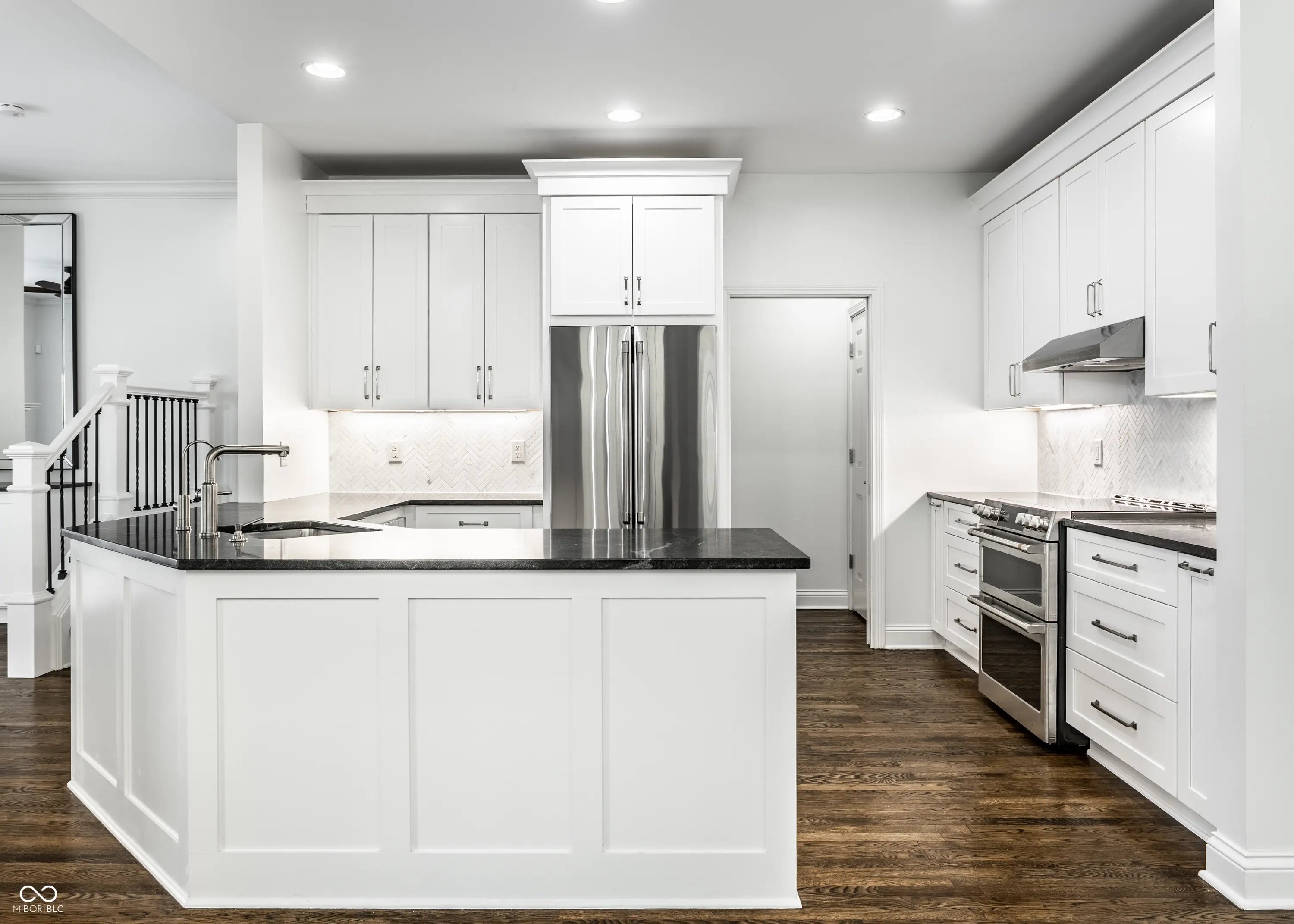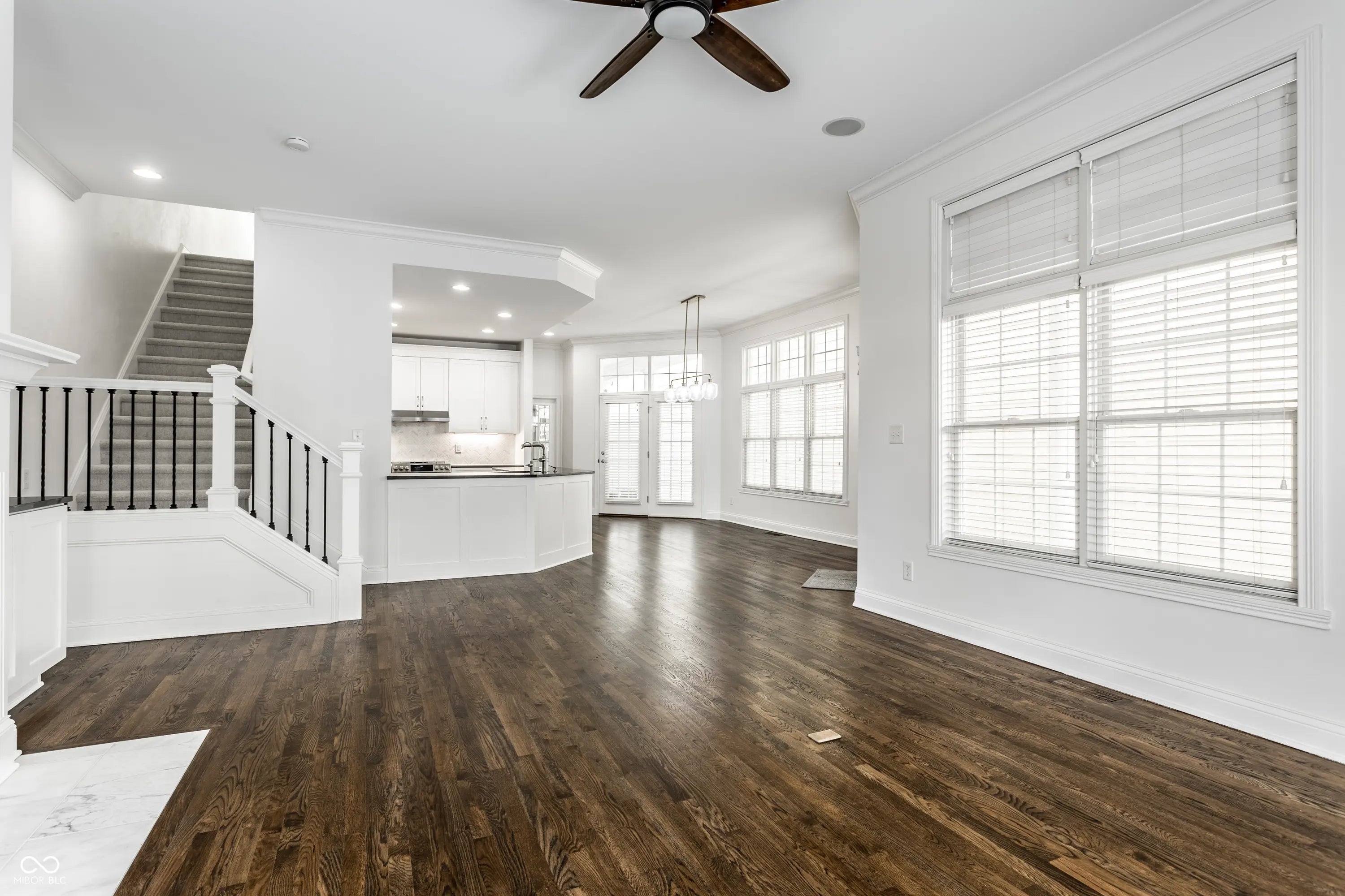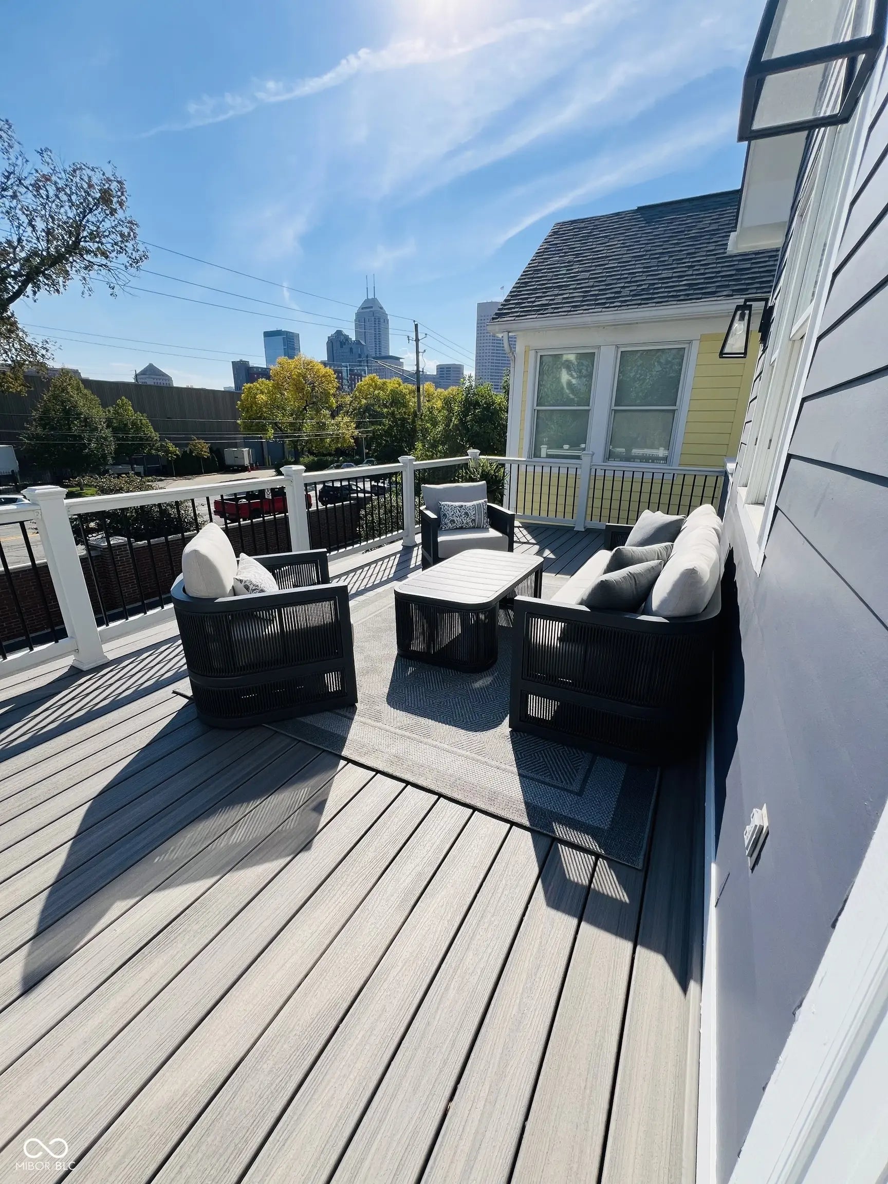 Beautifully remodeled home in the exclusive gated Watermark community in downtown Indianapolis. This move-in ready residence features refinished espresso hardwood floors, designer lighting, and abundant natural light throughout. The stunning living room showcases a new marble fireplace surround, Pottery Barn mirrors, and newly reconfigured stairs with elegant wrought iron spindles. The updated kitchen offers custom soft-close cabinetry with honed granite countertops, GE Cafe appliances, herringbone marble backsplash, pantry pull-outs, and an oversized granite peninsula. Flexible main-level bedroom is ideal for guests or a private home office. The luxurious primary suite features custom walk-in closets, spa-like bath with marble finishes, soaking tub, walk-in shower, and private balcony. An additional upstairs bedroom includes its own ensuite bath and walk-in closet. Finished basement includes a private bedroom, full bath, and kitchenette. Perfect for guests or multi-generational living. Enjoy the maintenance-free Trex deck with front-row seats to Fourth of July fireworks and an unbeatable location at the Canal and on the Monon, within walking distance to downtown dining, sports venues, and cultural attractions, as well as IU Health Hospital, the IU School of Medicine, and the Stutz Center.