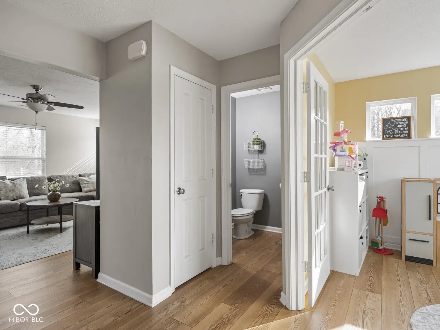 Light, bright, and beautifully maintained, this airy home is tucked away on a private corner lot in Brighton Knoll. Updated laminate wood flooring, fresh paint, and tasteful finishes create a cohesive, welcoming feel throughout the main level. Step inside to an inviting foyer that opens to a versatile front office or flex space with elegant French doors - perfect for working from home, hobbies, or a quiet den. A convenient half bath and coat closet sit nearby. The heart of the home shines in the open-concept living, dining, and kitchen area, where a wall of windows fills the space with natural light and frames peaceful backyard views. Wide walkways and seamless flow make entertaining effortless. A spacious walk-in pantry, under-stair storage closet, and an attached garage provide abundant storage solutions. Upstairs, a flexible loft offers endless possibilities (home office, workout zone, homework hub, playroom, or cozy lounge). The primary suite is a true retreat featuring a tray ceiling, private ensuite bath, and walk-in closet. Two additional bedrooms share a full bath, while the upstairs laundry room adds everyday convenience. Outside, the generous backyard sits at the rear of the neighborhood with tranquil tree-lined views. Residents enjoy community amenities including a pool, clubhouse, and playground, all within the highly regarded Noblesville Schools district.