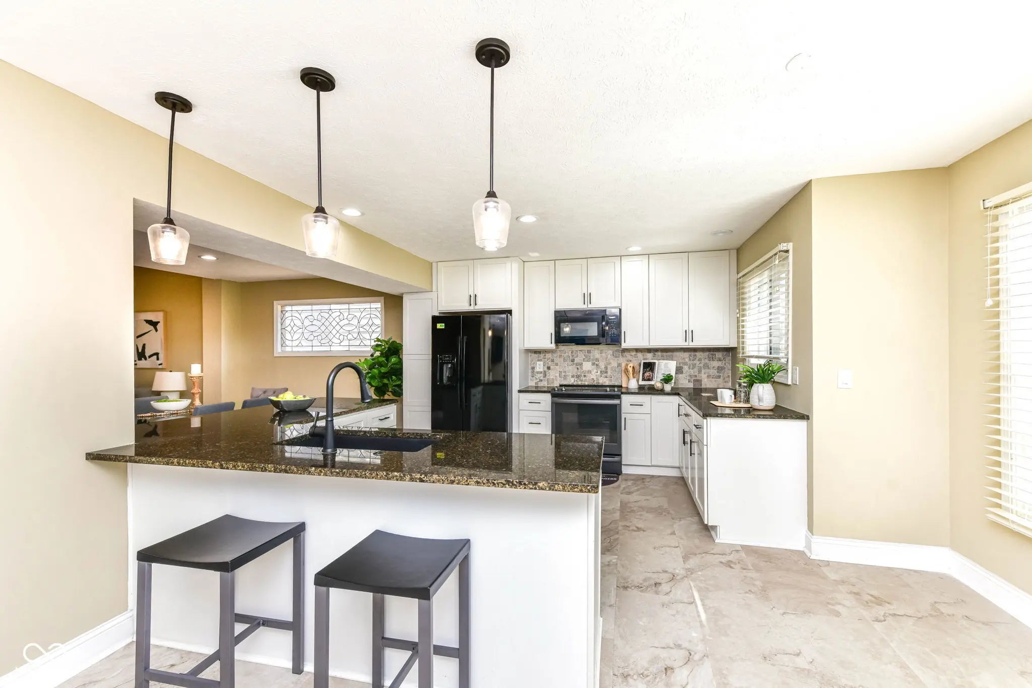 Live in Carmel at an Affordable Price! This beautifully maintained Lexington Farms home combines classic charm with modern updates. The large front porch and gable windows create wonderful curb appeal. Step inside to the dramatic vaulted Great Room with new vinyl plank flooring, open to a dining area highlighted by a leaded glass window. The redesigned upscale kitchen offers granite countertops, all new appliances, ample storage, and an island. Vinyl plank flooring flows throughout the main level, complemented by fresh paint, while new carpeting on the stairs and hallway add a fresh look. A first-floor bedroom/office features built-in bookshelves, a window seat, and a closet making it perfect for working from home. The family room features a wood-burning fireplace and glass doors to a large, low-maintenance deck. Enjoy relaxing in the fenced backyard with mature trees. The primary suite is a true retreat with vaulted ceiling and impressive corner windows. You will love the walk-in closet, double sinks, a soaking tub, and a separate shower. This home is ideally located-just 1/2 mile from the Monon Trail, less than a mile to the Monon Center and Central Park, with easy access to IN-31 and I-465.