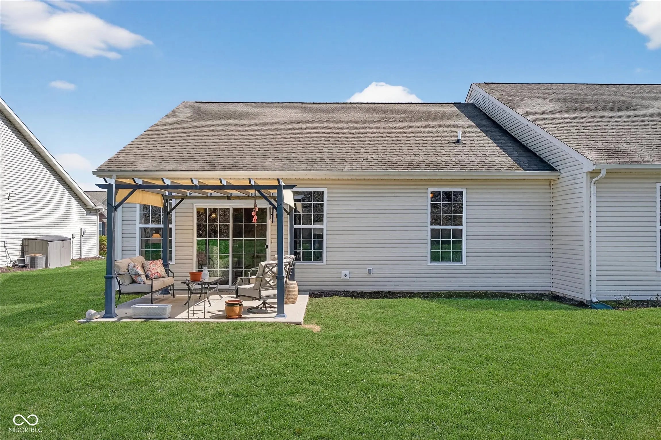 This well-maintained paired patio home offers comfortable, low-maintenance living with 2 bedrooms, 2 full bathrooms, and over 1,200 square feet of thoughtfully designed space. The home features 9-foot ceilings that make the interior feel even more spacious and open, along with a bright and functional layout where the living and dining areas flow nicely for everyday living and entertaining. The primary suite includes its own full bath and generous closet space, while the second bedroom is ideal for guests, a home office, or additional living flexibility. A finished two-car garage provides excellent space for parking and storage, while the outdoor living area truly shines with a wonderful rear patio featuring a pergola and a private, tree-lined backyard view, creating a peaceful setting perfect for relaxing or entertaining. Built just 9 years ago, the home and all major mechanical systems are also only 9 years old, offering peace of mind and modern efficiency. Located in a low-maintenance community where the HOA covers lawn care, snow removal, trash service, mulch, and leaf cleanup, this property allows you to spend less time on upkeep and more time enjoying your home. The location adds even more appeal with close proximity to shopping, dining, and everyday conveniences, along with easy access to major interstates, making commuting throughout the Indianapolis area simple. With its newer construction, spacious feel, private outdoor setting, and true low-maintenance lifestyle, this home presents a fantastic opportunity for buyers seeking comfort and convenience.