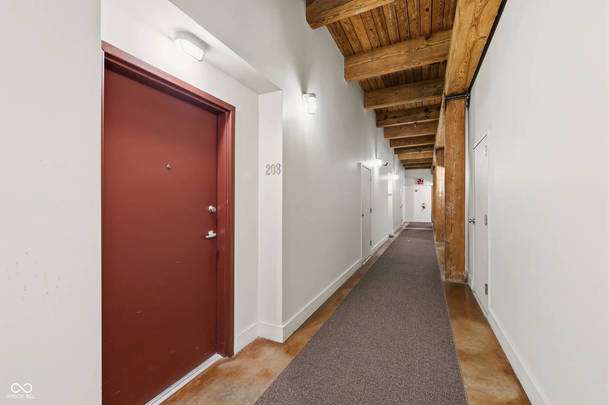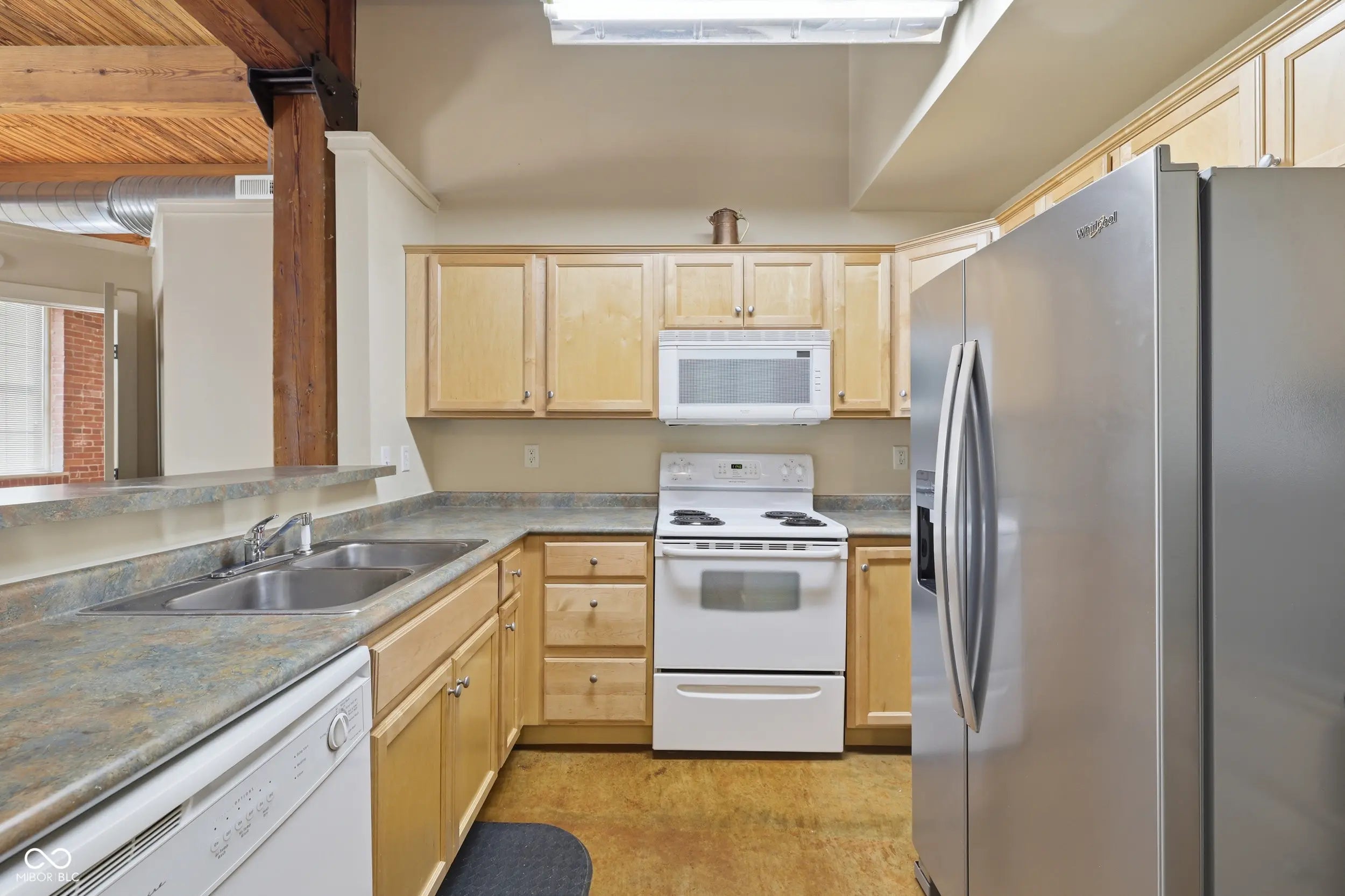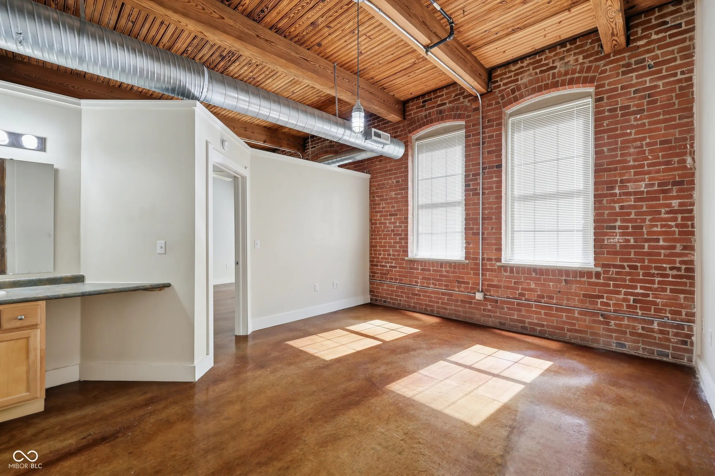 Welcome to H. Lauter Lofts, one of Indianapolis' most distinctive historic conversions, where 100-year-old industrial character sets the stage for everyday downtown-adjacent living. Unit 208 is a loft-style 1-bedroom, 1-bath condo with real character, featuring 12-foot wood beam ceilings, exposed brick walls, exposed ductwork, and warm stained concrete floors that give the space a richness that newer construction simply can't replicate. The open living area gets good natural light through large windows and opens directly to a private balcony. The bedroom is generously sized with the same soaring beams overhead, a closet, and direct access to the full bath. One of the standout features of this unit is the reserved underground parking space, something not every unit in the building includes. Combined with elevator access, a fob-secured lobby, and an intercom system for guests, the day-to-day logistics of city living are well covered here. Positioned just west of downtown, you're close to IU Indianapolis, Riley and Eskenazi hospitals, and the growing medical and research corridor along the White River. Lucas Oil Stadium, Victory Field, Gainbridge Fieldhouse, the Indianapolis Zoo, and White River State Park are all just minutes away. Whether you're a first-time buyer, a student, a medical professional, or simply looking for a low-maintenance place with genuine character, Unit 208 offers solid value in a building unlike anything else at this price point.