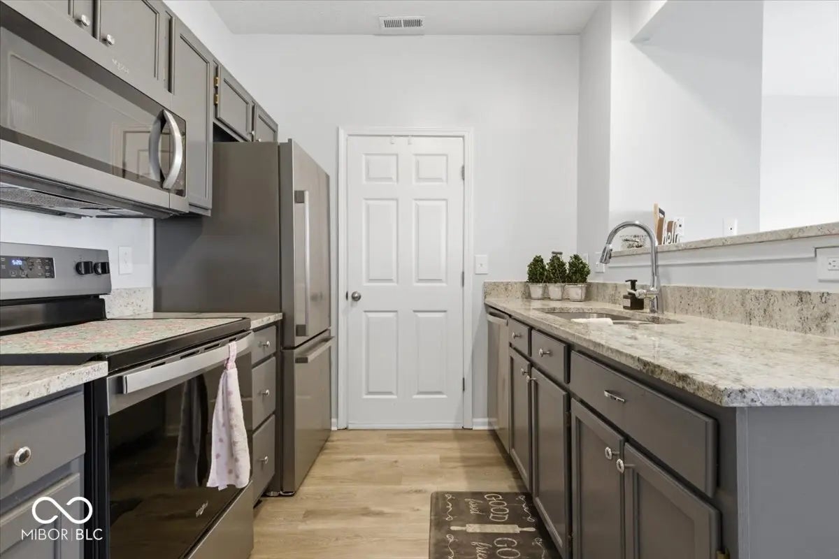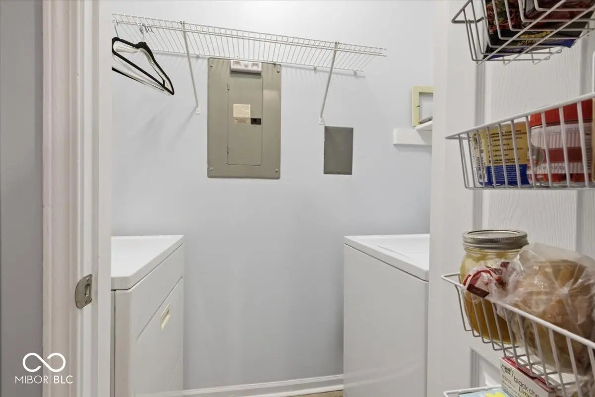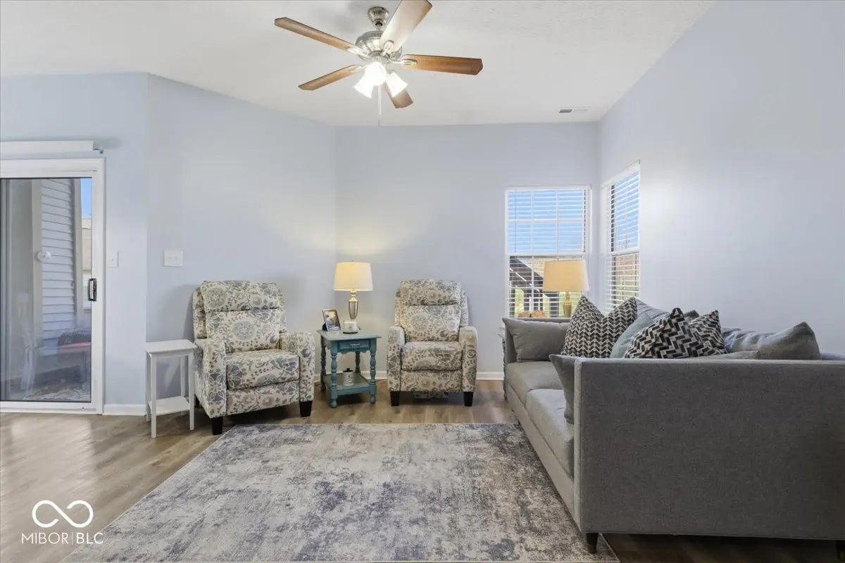 Welcome home to this charming west-side condo minutes away from Eagle Creek Park offering convenient main-level living and an inviting open layout. With soaring 9-foot ceilings and a freshly painted interior, the space feels bright, clean, and move-in ready. Upon entry, the open-concept living area flows seamlessly into the dining space, creating a comfortable setting for everyday living and entertaining. The kitchen features granite countertops, stainless steel appliances, refreshed cabinetry, breakfast bar and a pantry for additional storage. A conveniently located laundry closet sits just off the kitchen. Both bedrooms are generously sized and feature newer carpet, while the spacious primary bedroom includes elegant French doors and a large walk-in closet. The bathroom offers a walk-in shower. Additional updates and features include a fiberglass water heater installed in 2024 a furnace and AC system installed in 2020 and regularly serviced. The washer and dryer are also included, adding to the home's move-in-ready convenience. The unit also offers a private storage area off of the covered patio, a one-car garage, and an additional reserved parking space. Move-in ready and low maintenance, this well-maintained condo offers comfortable living in a convenient west-side location.