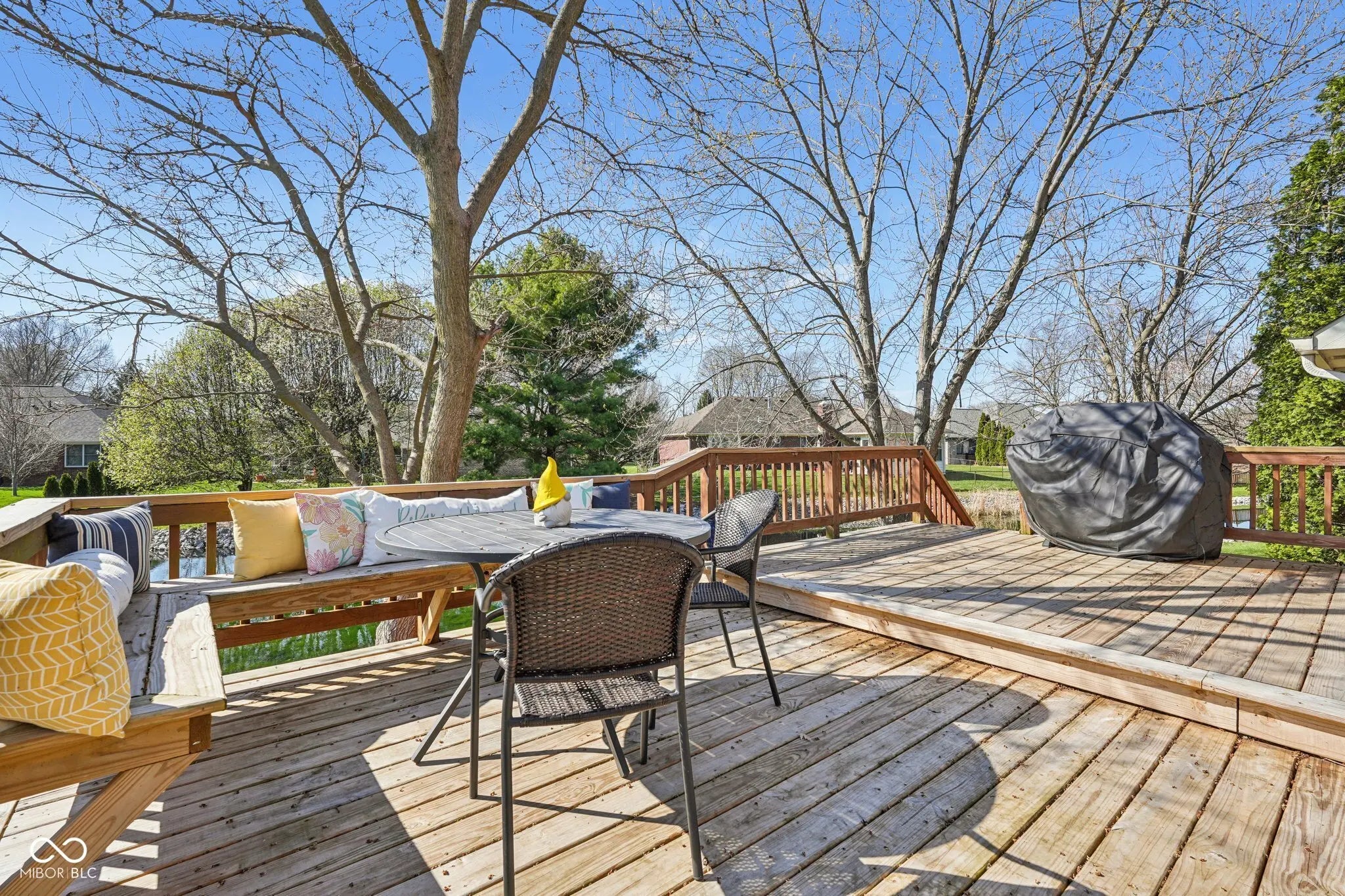 This stunning 4-bedroom, 3.5-bathroom custom brick home offers the perfect blend of modern updates and serene waterfront living on a quiet cul-de-sac within the highly-regarded Center Grove Community Schools. The thoughtfully designed floor plan features a sought-after main-level primary suite, providing convenience and privacy. The heart of the home is the beautifully renovated kitchen, boasting sleek cabinetry, granite countertops, and a large center island that flows into a vaulted living room with a cozy brick fireplace. Throughout the main level, you will find stylish new laminate plank flooring and updated light fixtures installed in 2022. The expansive finished basement offers incredible versatility, complete with a kitchenette and full bath, making it an ideal space for a home theater, gym, or guest suite. Step outside to your private oasis featuring a multi-level back deck with brand-new boards (2024), overlooking a lush yard and a peaceful pond. Extensive recent capital improvements provide total peace of mind, including brand-new siding and exterior doors (2025), a new water heater (2023), updated bathrooms (2022), new carpet on the stairs (2022), and a roof only ten years old. Located in the desirable Brookstone subdivision, this move-in-ready gem combines custom craftsmanship with a premier location. Don't miss your chance to own this exceptional property!