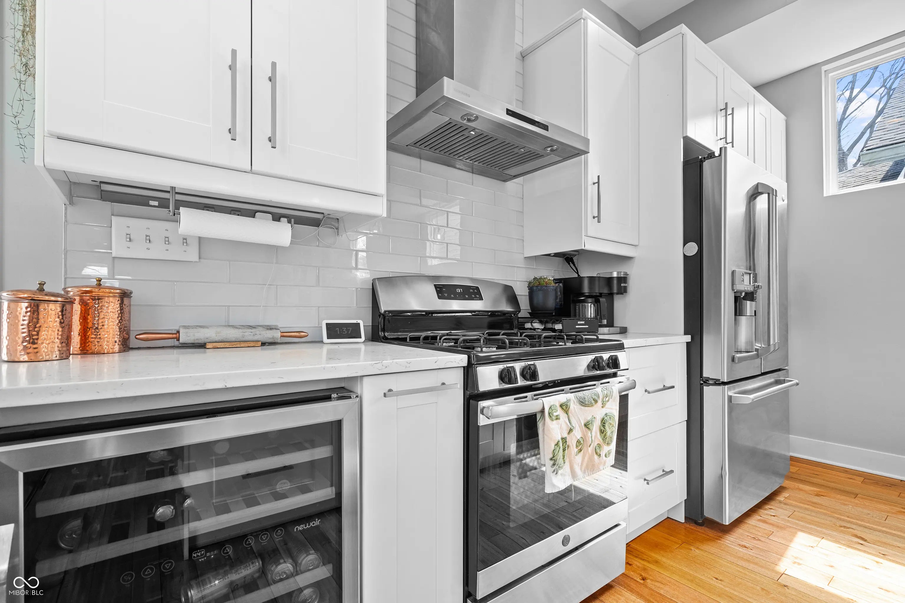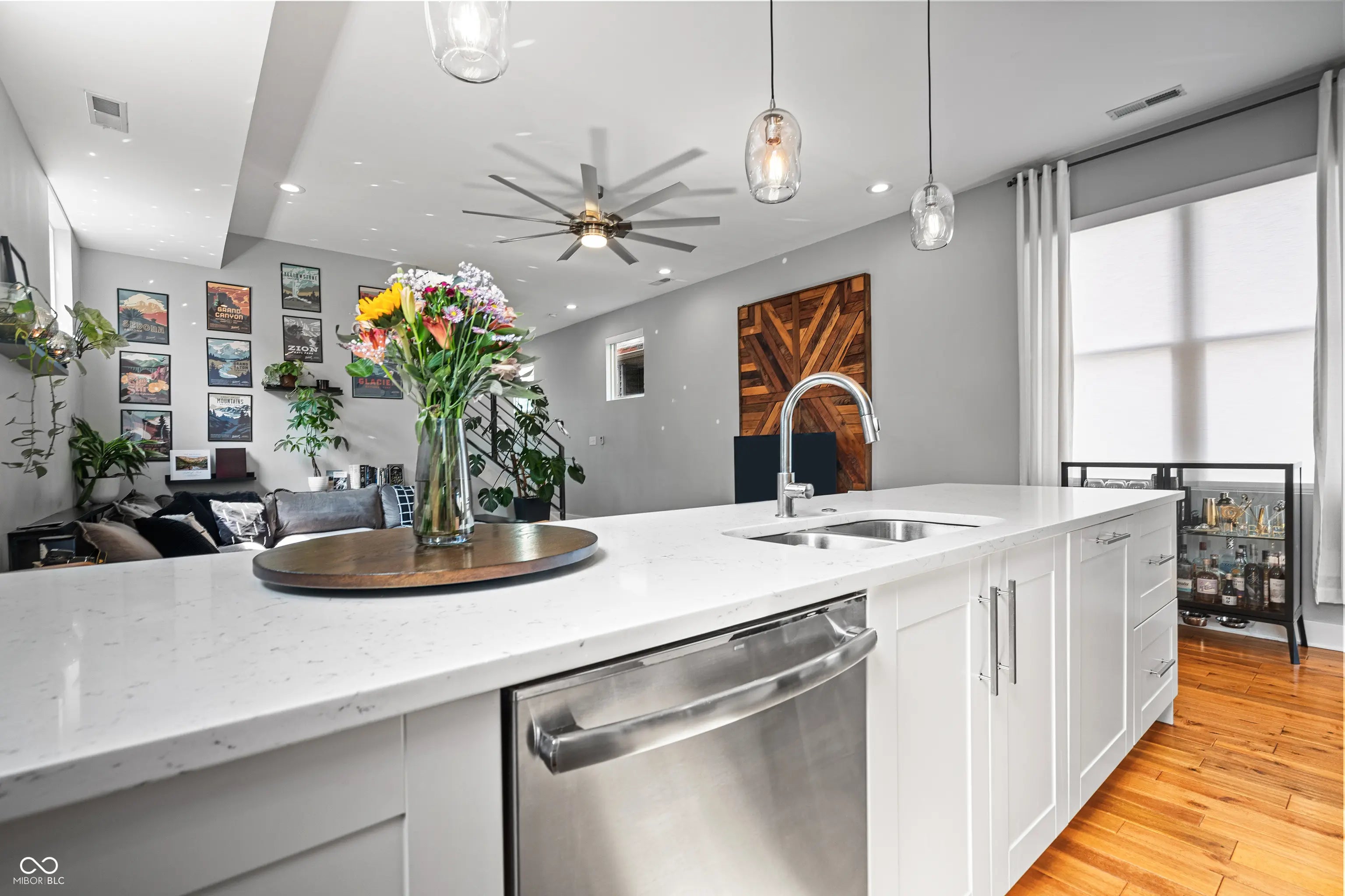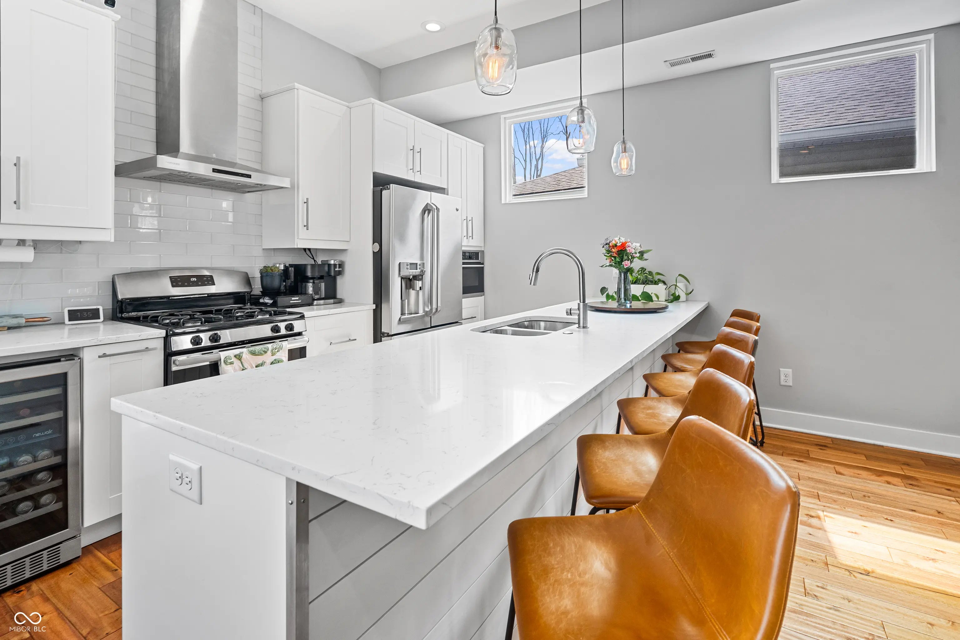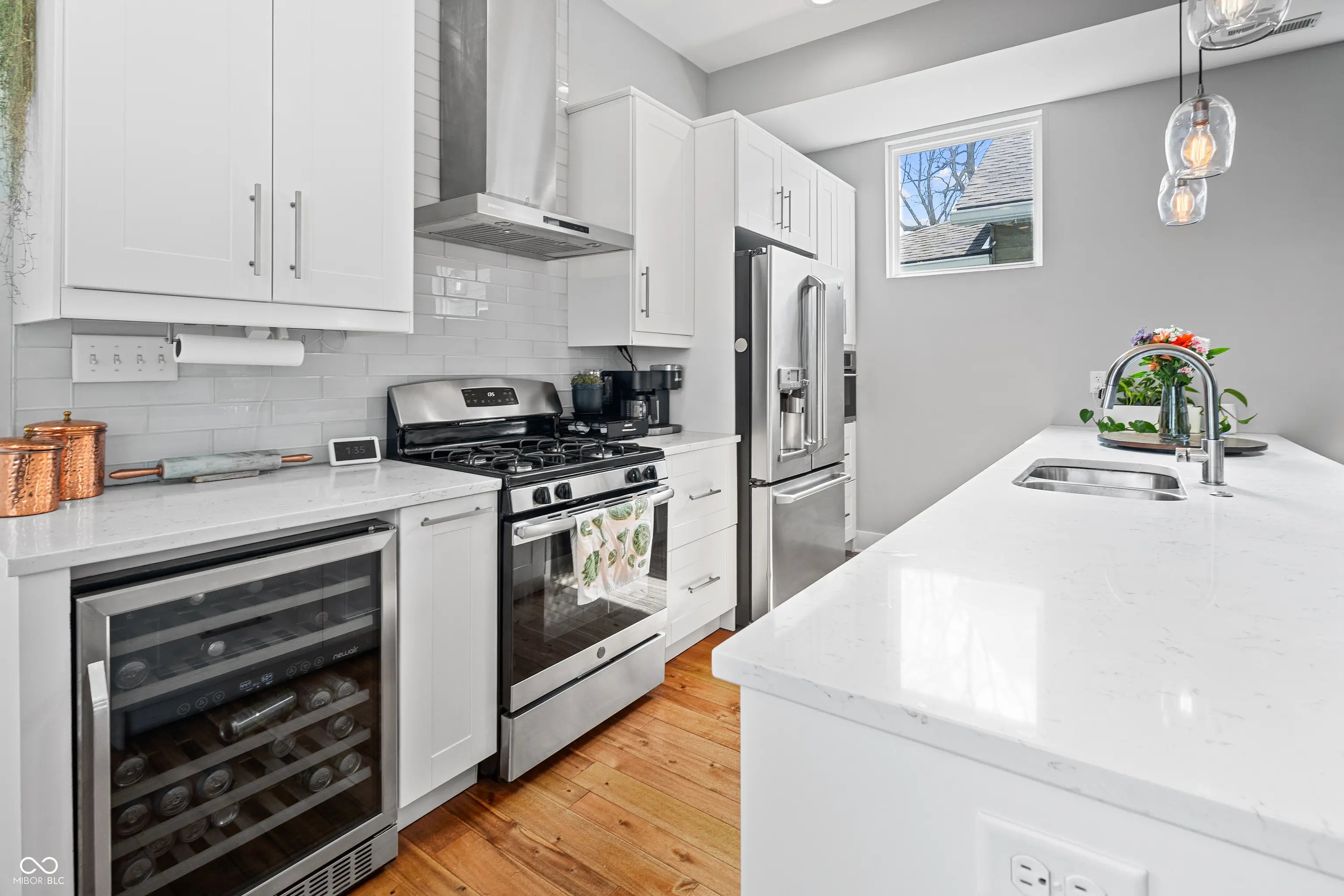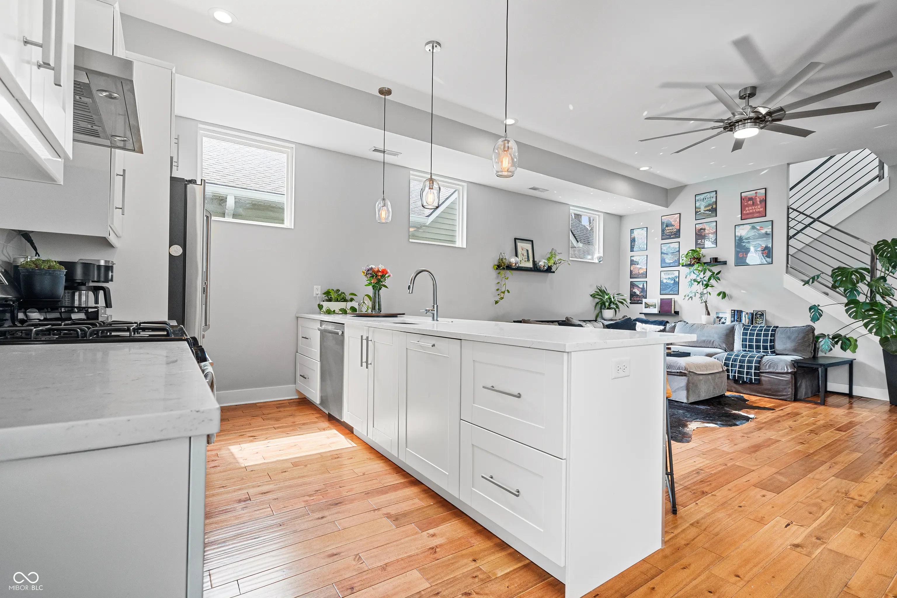 Welcome home to your Fountain Square dream home! This stunning 3 bedroom, 3 bathroom home perfectly blends modern style with functional living. Step inside to find LVP floors that guide you through a bright, open concept main level. The gourmet kitchen is a chef's delight, boasting stainless steel appliances, custom cabinetry, quartz counters, subway tile backsplash, updated light fixtures, a built-in wine cooler, and a massive peninsula that is perfect for entertaining. It flows effortlessly into the spacious living area, creating an ideal layout for gathering. A versatile main floor bedroom features a generous walk-in closet and easy access to a full bath, perfect for a guest bedroom, a home office or a formal dining room. Walk up the modern staircase to your private sanctuary! The primary suite is a perfect oasis, offering an elegant en-suite bathroom with subway tiled, glass enclosed shower and double vanity. Don't miss the large walk-in closet and direct access to the private second story balcony, perfect for morning coffee. Lastly, your second living space in the loft is a great retreat away from it all. The outdoor space is a true entertainer's paradise, featuring a fully fenced in rear yard, rope lighting running front to back and a spacious porch ready for summer BBQs. Rounding out the property is a detached two car garage, providing secure parking and ample extra storage. Come see it today!
