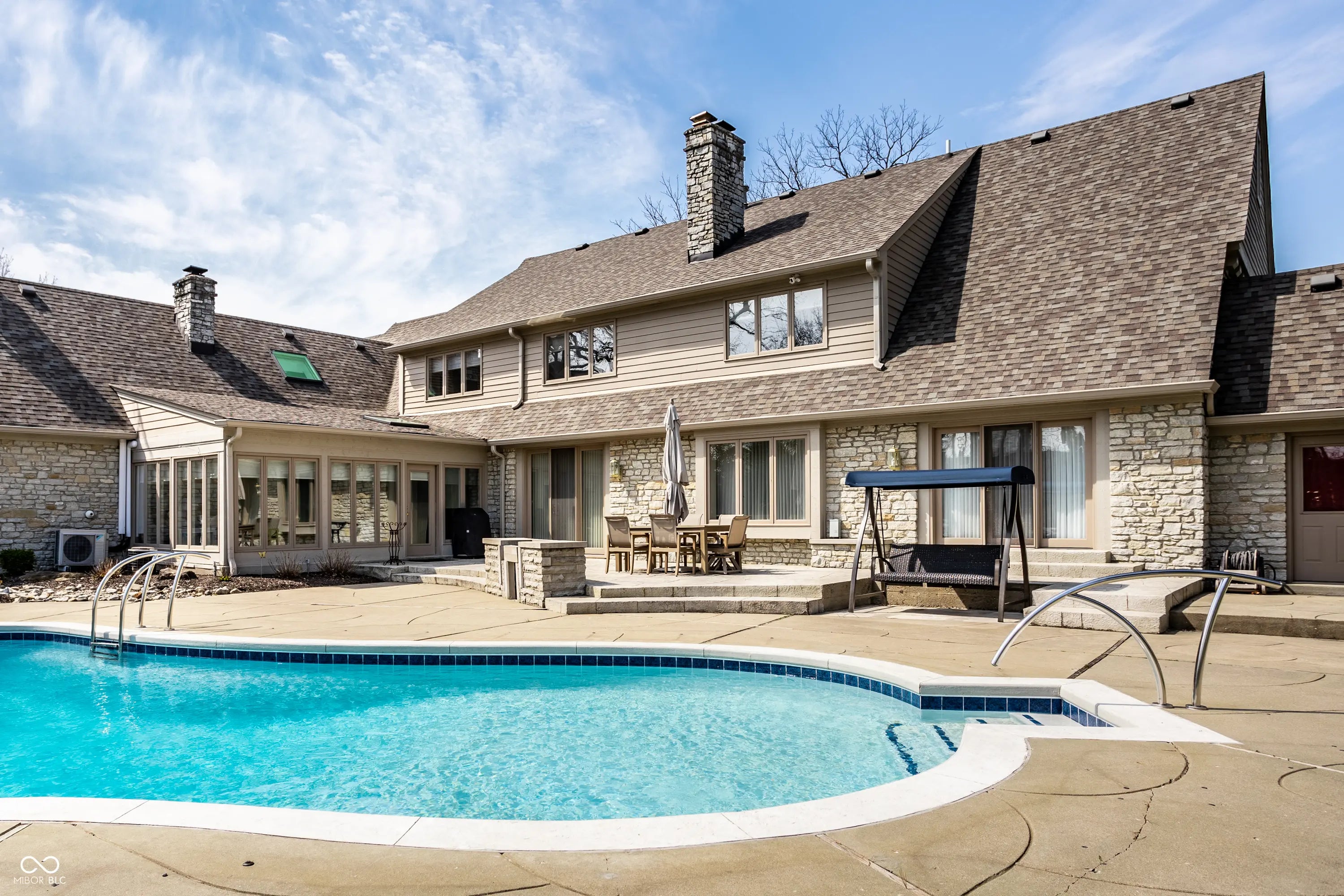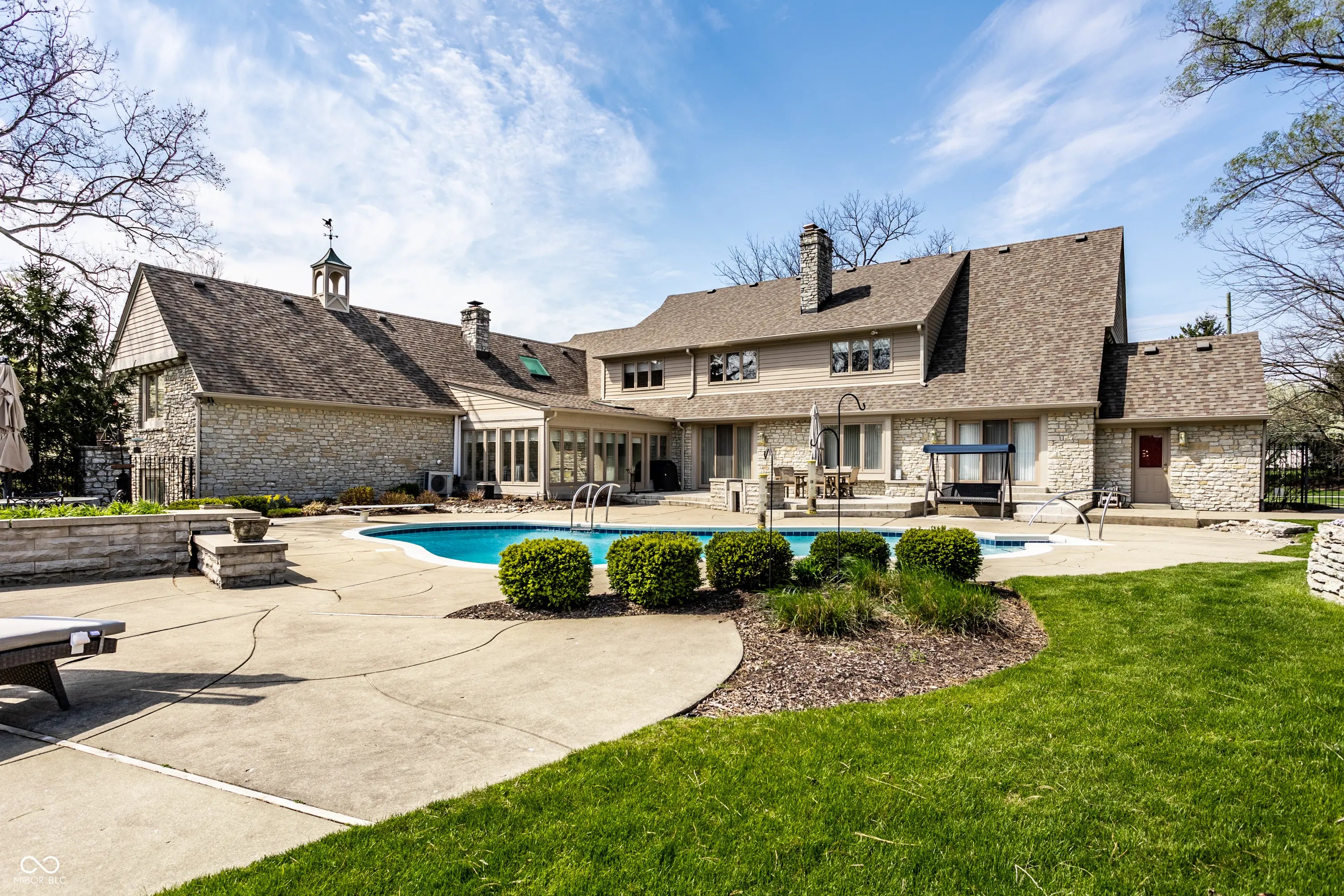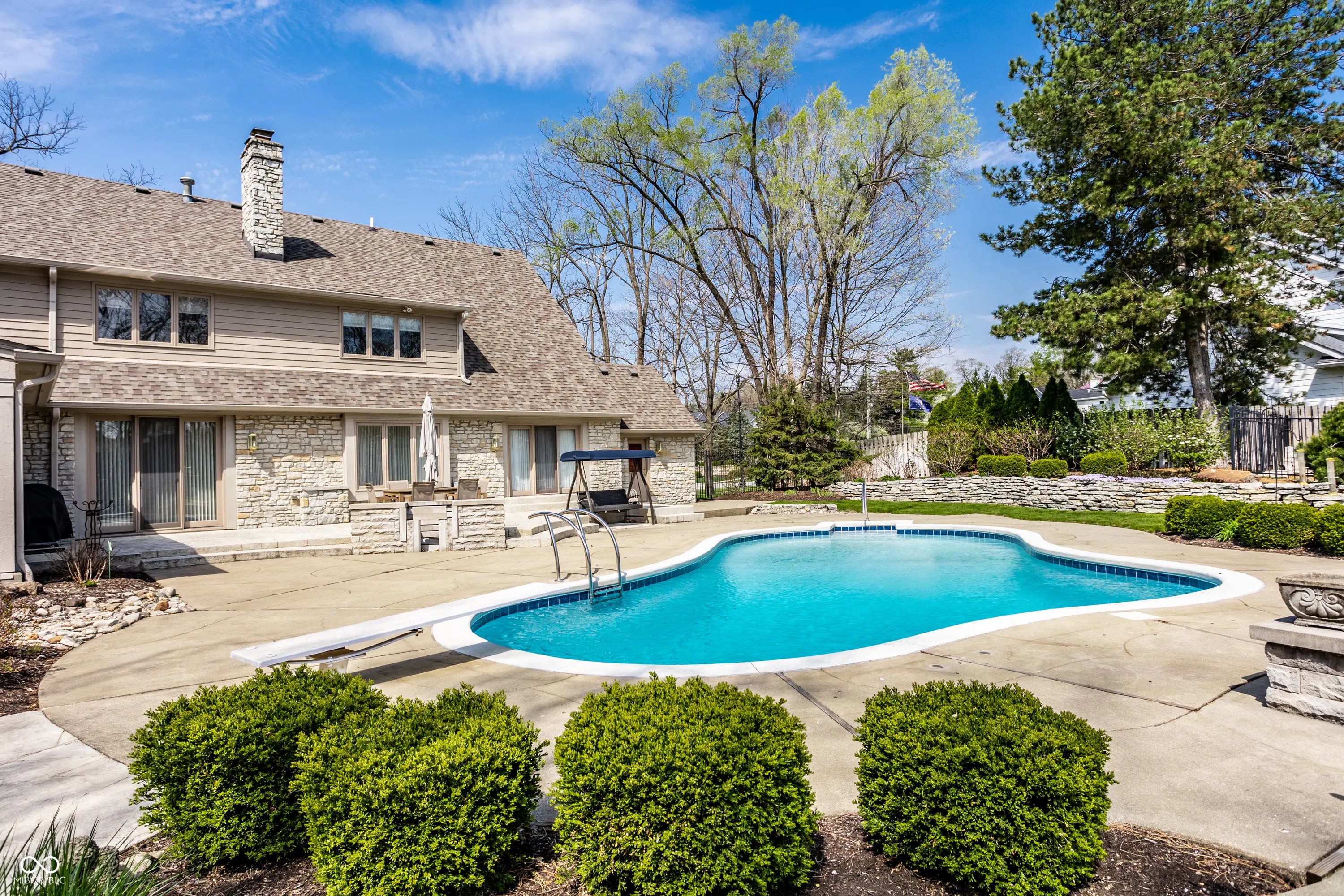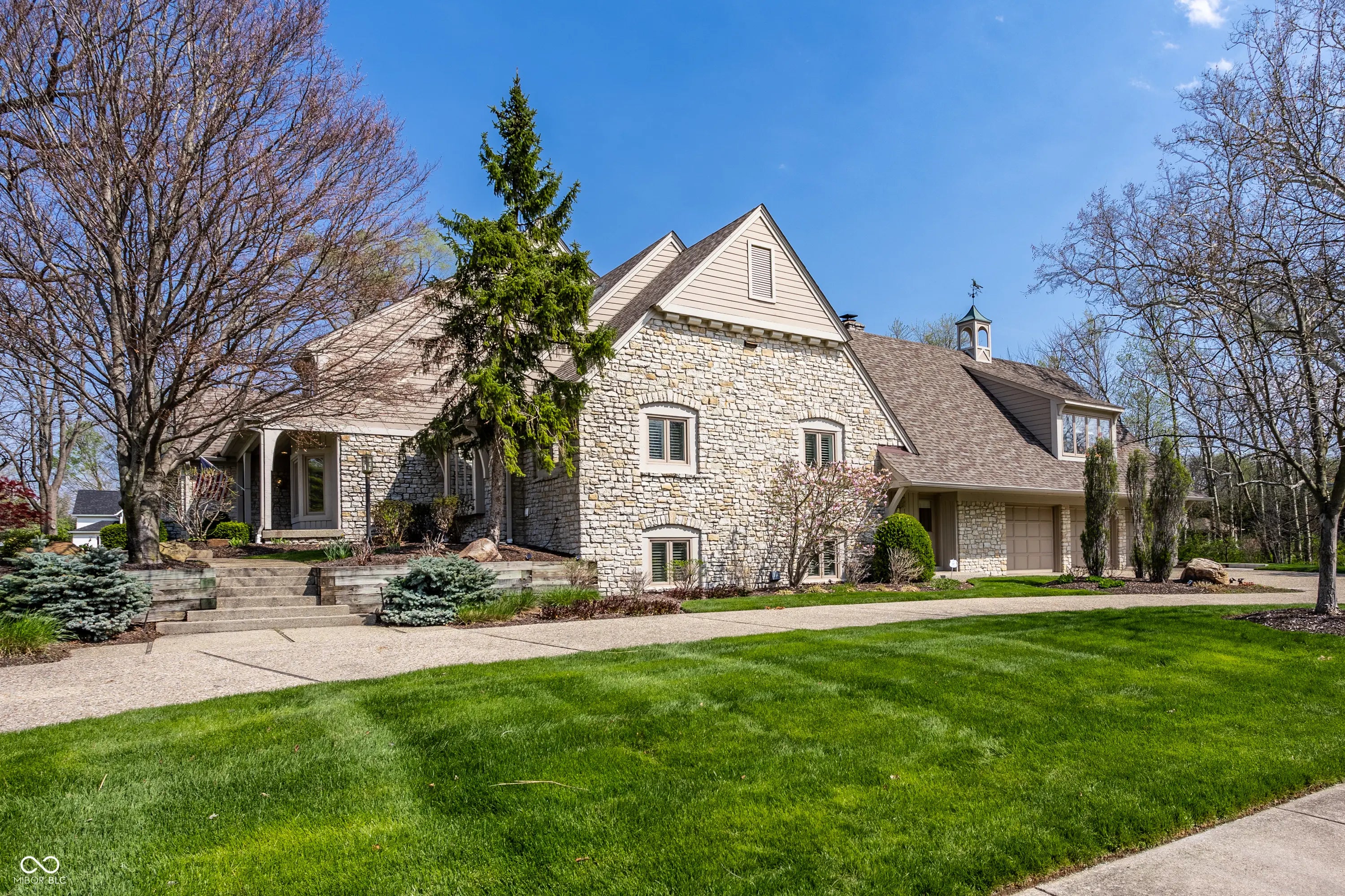 Welcome to 4826 Deer Ridge Drive North, an iconic Carmel estate showcasing a striking stone exterior, timeless architecture, and exceptional curb appeal, set on a private one-acre homesite with mature Aspen trees and a peaceful creek. With over 9,200 square feet of living space, this custom-built home features 5 bedrooms, 5 full & 3 half baths, designed for both luxury & functionality. Inside you'll find quality craftsmanship throughout, including solid wood trim, vaulted 9-foot ceilings, skylights, & abundant natural light. The updated kitchen is a true centerpiece with custom cabinetry, solid surface countertops, a new KitchenAid stainless steel appliance package with warming drawer, designer backsplash, & large pantry, all opening to a dramatic two-story hearth room with stunning stone fireplace. The main level offers multiple living spaces, including a formal dining room, sunroom with its own climate control, & family room with custom built-ins. The primary suite, remodeled in 2020, features a sitting area, spa-like bath with soaking tub, walk-in shower, dual vanities, & expansive California Closets walk-in closet, with the option to convert back to a 6th en-suite bedroom. Upstairs includes 3 spacious bedrooms with a separate HVAC system, while a private bonus room suite above the garage, full bath, & independent heating and cooling-is ideal for guests or multi-generational living. The finished daylight basement offers new LVP flooring, a wet bar, updated bath, and ample storage. Outdoors, enjoy a fully fenced backyard with luxury gunite pool surround (2022), separate garden area, and dedicated pool changing room with bath access. Additional highlights include a 3-car garage with epoxy flooring, exposed aggregate driveway, multiple fireplaces, updated lighting, added insulation, and a new Carrier furnace (2025). Located near Carmel's top parks, trails, dining, and schools, this home offers a rare combination of space, privacy, and convenience.