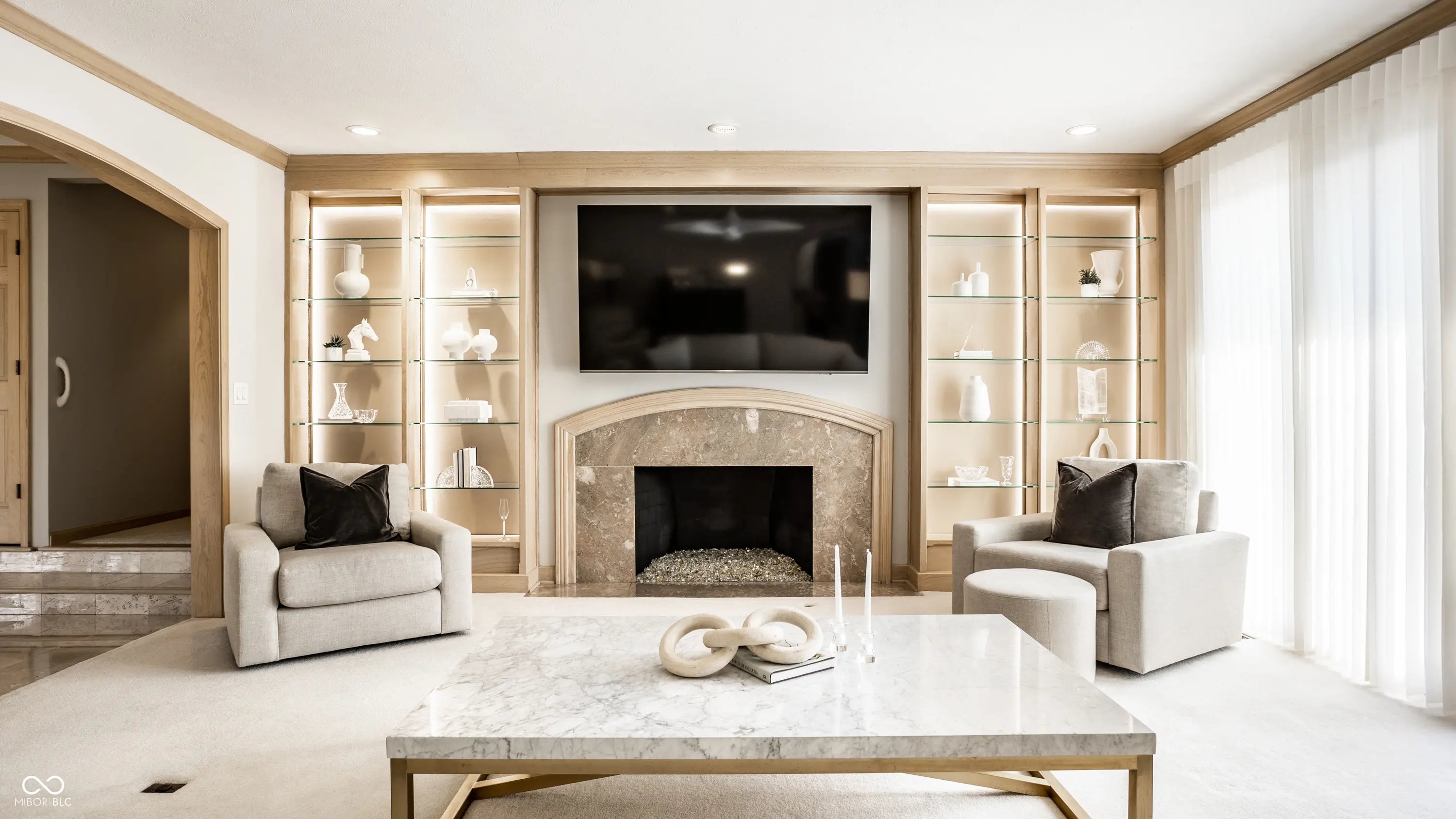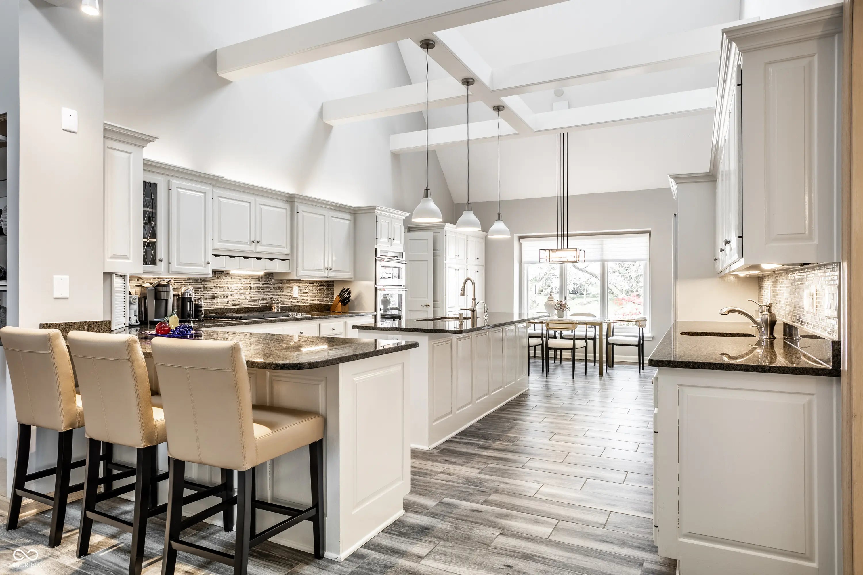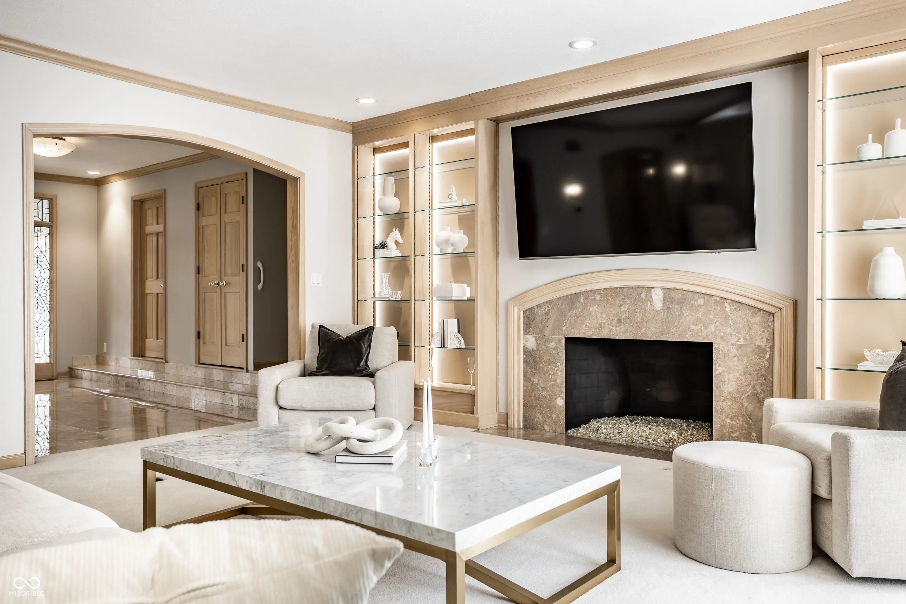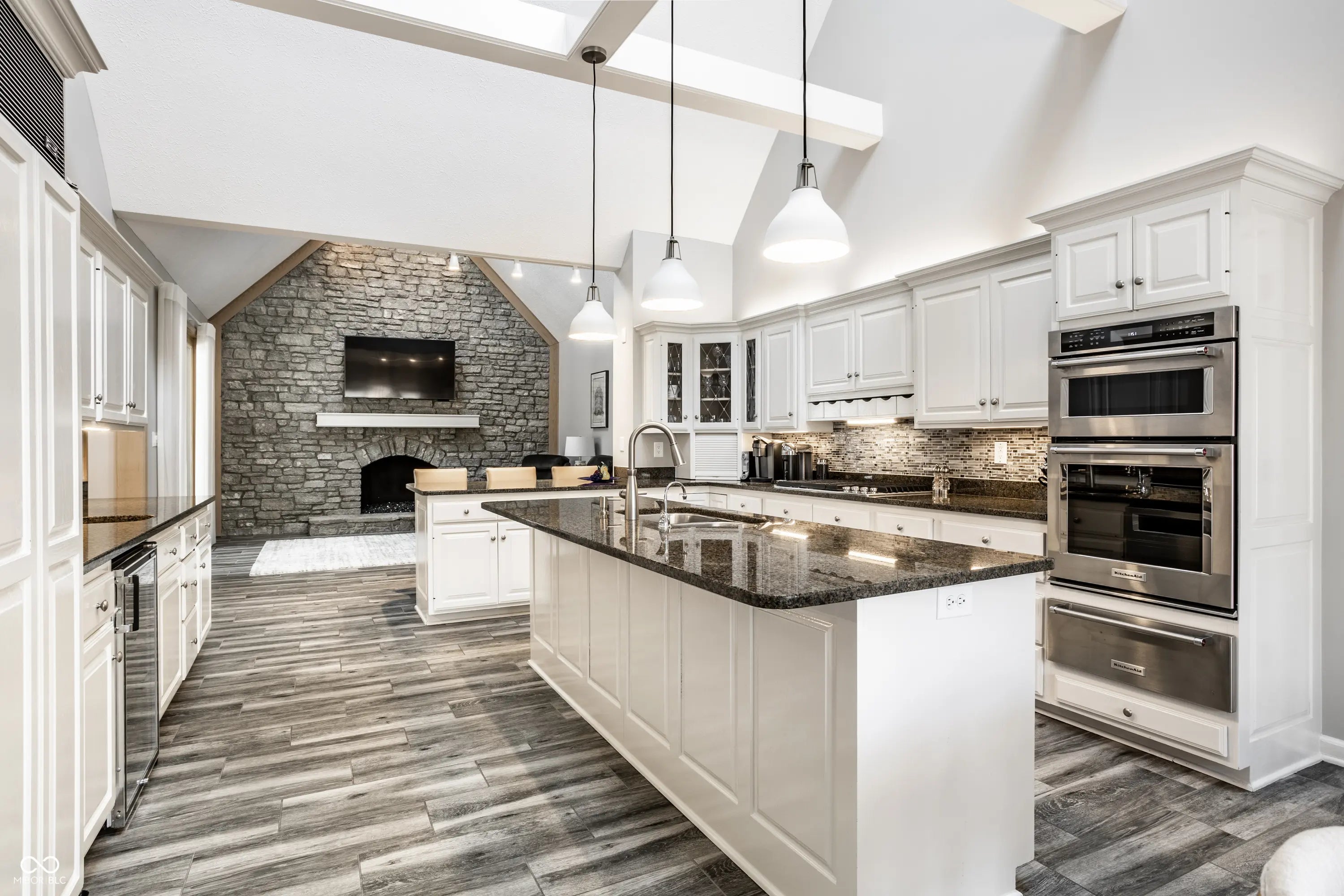 Welcome to 4826 Deer Ridge Drive North, an iconic Carmel estate showcasing a striking stone exterior, timeless architecture, and exceptional curb appeal, set on a private one-acre homesite with mature Aspen trees and a peaceful creek. With over 9,200 square feet of living space, this custom-built home features 5 bedrooms, 5 full & 3 half baths, designed for both luxury & functionality. Inside you'll find quality craftsmanship throughout, including solid wood trim, vaulted 9-foot ceilings, skylights, & abundant natural light. The updated kitchen is a true centerpiece with custom cabinetry, solid surface countertops, a new KitchenAid stainless steel appliance package with warming drawer, designer backsplash, & large pantry, all opening to a dramatic two-story hearth room with stunning stone fireplace. The main level offers multiple living spaces, including a formal dining room, sunroom with its own climate control, & family room with custom built-ins. The primary suite, remodeled in 2020, features a sitting area, spa-like bath with soaking tub, walk-in shower, dual vanities, & expansive California Closets walk-in closet, with the option to convert back to a 6th en-suite bedroom. Upstairs includes 3 spacious bedrooms with a separate HVAC system, while a private bonus room suite above the garage, full bath, & independent heating and cooling-is ideal for guests or multi-generational living. The finished daylight basement offers new LVP flooring, a wet bar, updated bath, and ample storage. Outdoors, enjoy a fully fenced backyard with luxury gunite pool surround (2022), separate garden area, and dedicated pool changing room with bath access. Additional highlights include a 3-car garage with epoxy flooring, exposed aggregate driveway, multiple fireplaces, updated lighting, added insulation, and a new Carrier furnace (2025). Located near Carmel's top parks, trails, dining, and schools, this home offers a rare combination of space, privacy, and convenience.